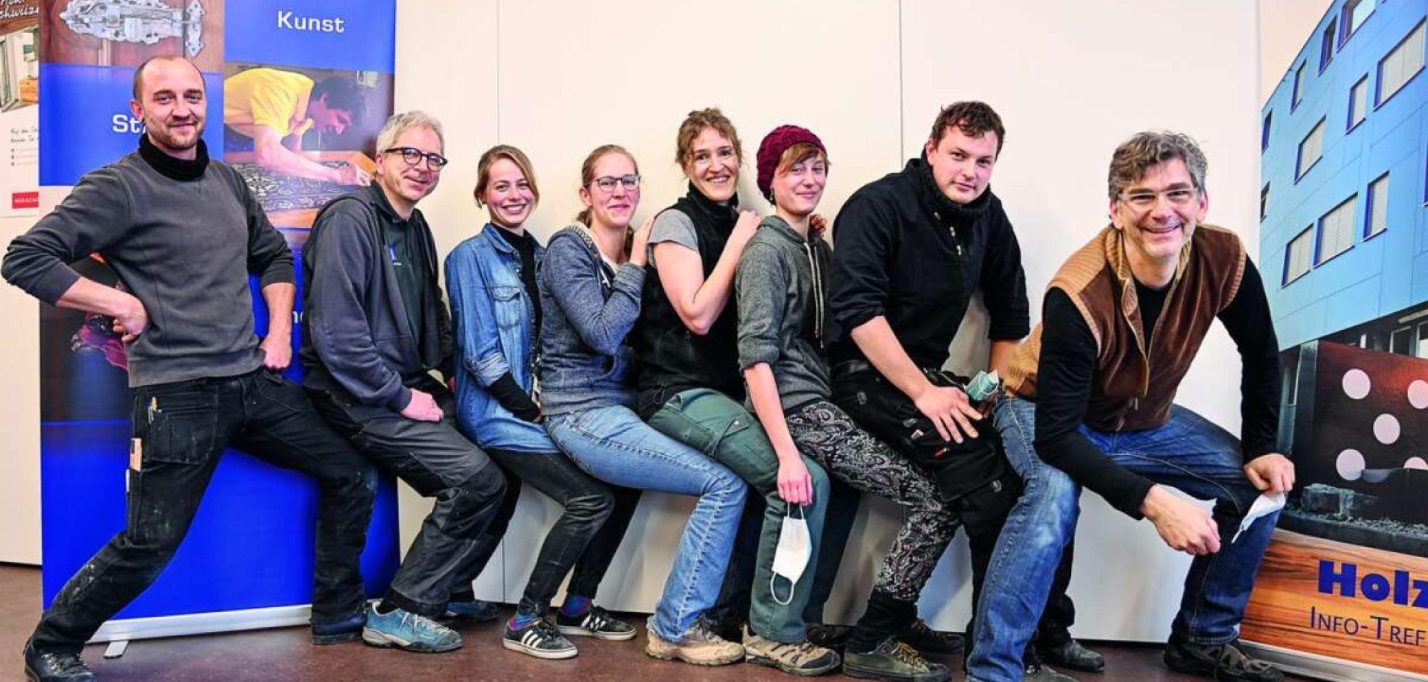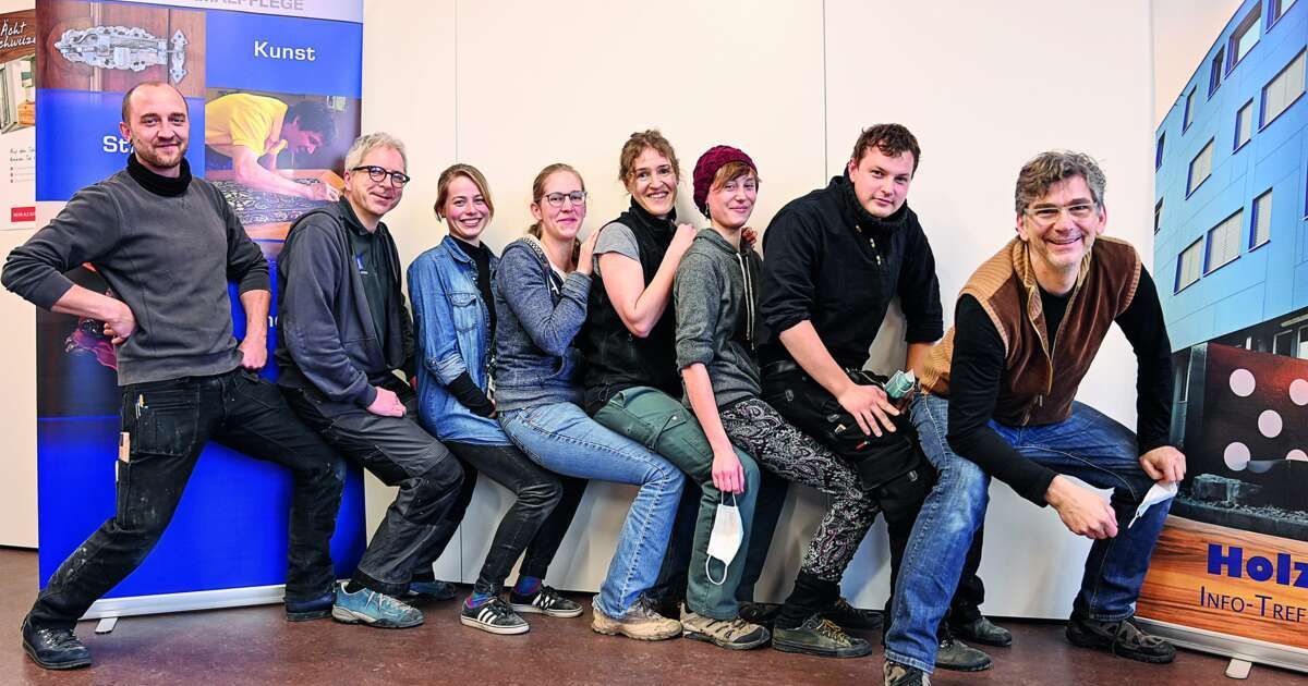 Die Absolvierenden haben die Maske fürs Gruppenbild kurz abgenommen (v. l.): Pascal Hofer, Christian Hartmann, Christine Baader, Franziska Rölli, Márcia Bieri, Priska Bieri, Eric Trummer und Daniel König. Bild: Pius Duss