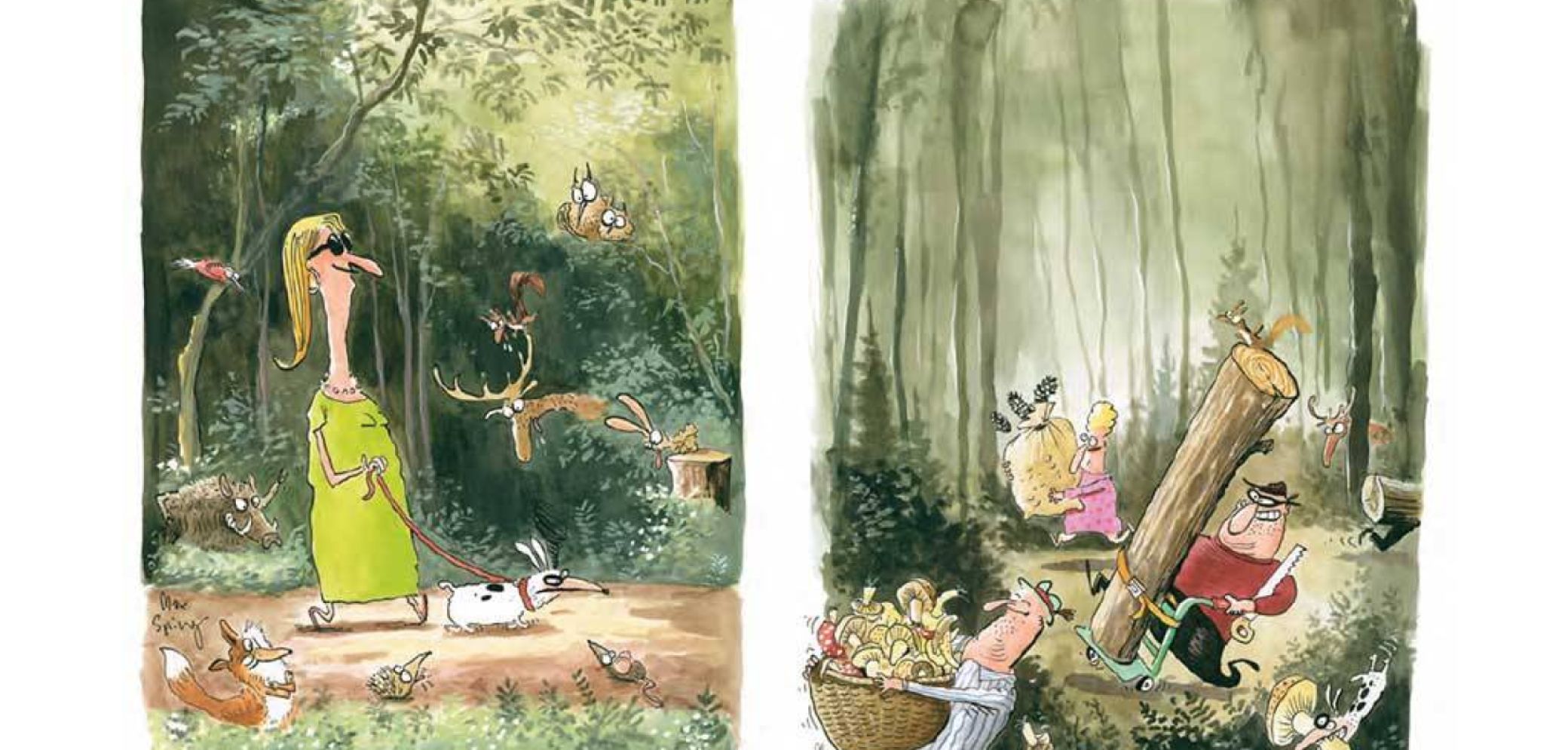 «Alle Verhaltens-Tipps sind positiv formuliert; denn wir wollen nicht mit dem Zeigefinger auf die Waldbesuchenden zeigen, sondern durchaus mit einem Augenzwinkern mit dem Wald-Knigge zu einem friedlichen Nebeneinander beitragen», sagt Regina Wollenmann und nimmt damit Bezug auf die Cartoons, die im unverkennbaren Stil von Max Spring humorvoll zugespitzt gezeichnet wurden.