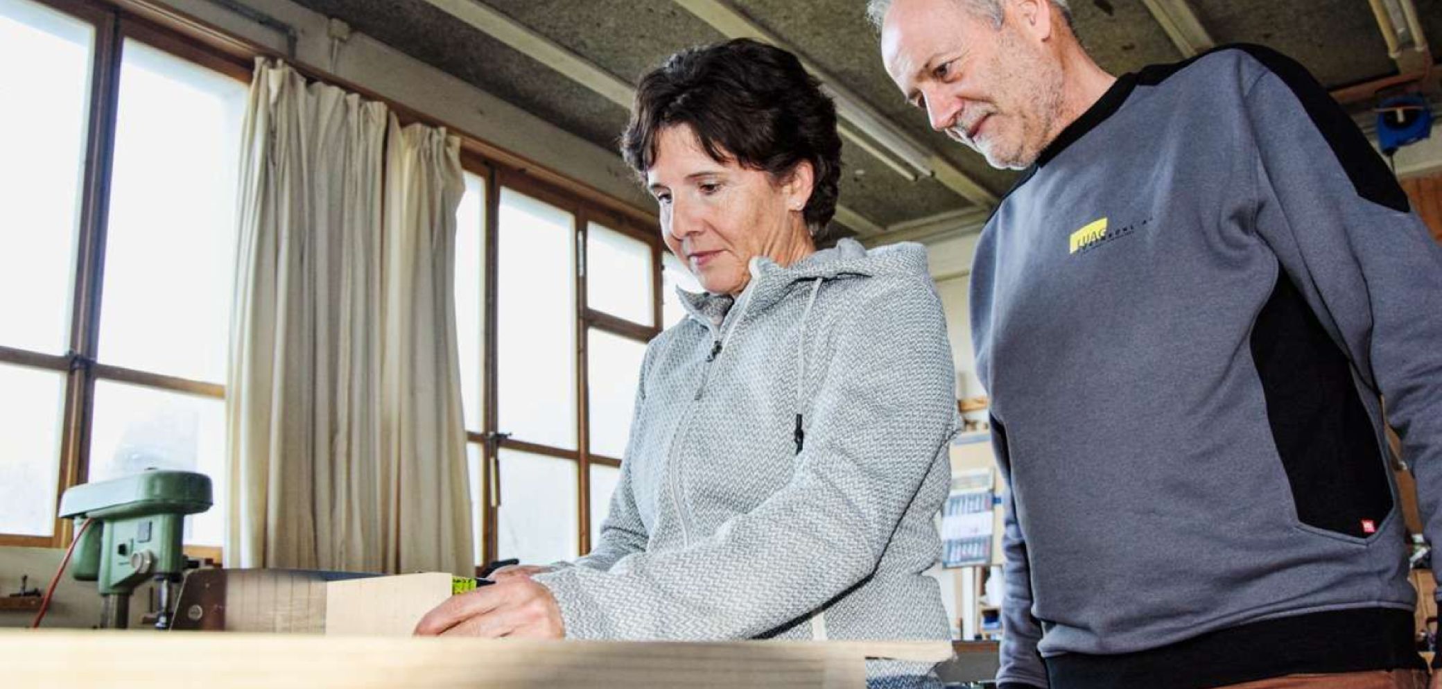 Beim Schnuppertag machte auch die Schreinerei Luag aus Krattingen BE mit. Geschäftsleiter Fred Luginbühl (im Bild mit Hauswirtschaftslehrerin Christa Josi) sieht den Tag als Bereicherung. «Der Lehrer weiss am besten, wo ein Schüler seine Stärken hat. Er kennt auch sein Umfeld und kann deshalb eine Einschätzung machen, welcher Schüler in welchen Betrieb passt.»