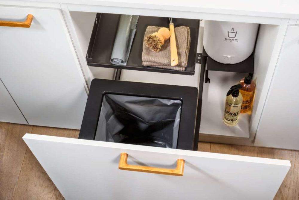 Will man in der Küche einen Quooker einbauen, stellt sich die Frage: Was muss man dafür rauswerfen? Nichts, findet Peka. Neben ihrem «Oeko Complet Aqua» gibt es genug Platz. Das Abfallsystem wurde mit dem Ziel entwickelt, Wassergeräte wie jene von Quooker oder Grohe verbauen zu können, ohne dafür ein eigenes Unterschrank-Element hergeben zu müssen. In einem für Abfallsysteme typischen 600 mm breiten Element hat beides nebeneinander Platz. Der 40-Liter-Eimer verfügt über Pekas Spannsystem für Müllbeutel. Der Eimer gleitet auf robusten Auszugsschienen, die dank inte- grierter Softopen- und Softclose-Mechanismen sanft öffnen und schliessen. Das Abdecktablar ist aus Stahlblech und schliesst gegenüber den Wasserinstallationen sauber ab.