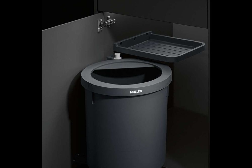 Mit der Produktlinie «D-Line» hat Müllex ein variables System entwickelt. Aus dem Behälter für eine Müllsorte wird, dank einem optionalen Trennsteg, ein Zwei-, Drei- oder Viermülltrennsystem. Nicht nur die Handhabung ist laut Hersteller komfortabel, sondern auch die Montage soll einfach sein. Mit einer Wandhalterung und einem Bolzen wird der Behälter an der Seitenwand befestigt. Die in den Boden des Behälters eingegossene Bajonettführung ermöglicht ein leichtes Ein- und Ausfahren des Behälters und erlaubt eine einfachere Reinigung des Küchenunterschrankes. Ein Ablagefach bietet zusätzlichen Stauraum für Sackrollen, Reinigungsmaterial, Spülmittel. Mit ihrem zeitlosen Design in mattem Anthrazit und perlweissen Akzenten passt sich «D-Line» nahtlos in moderne Küchen ein.