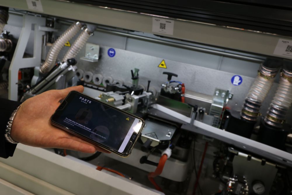 Biesse zeigte anhand einer Kantenleimmaschine eine Möglichkeit, wie der Schreiner mit Hilfe seines Smartphones oder Tablets die benötigte Anleitung direkt zur Hand hat. An jedem Aggregat ist ein QR-Code angebracht, welcher den Nutzer auf eine Seite mit den jeweiligen Bedienungsanleitungen verlinkt. Beim Leimaggregat wird der Nutzer beispielsweise sogar mit einem Video bei der Reinigung unterstützt.