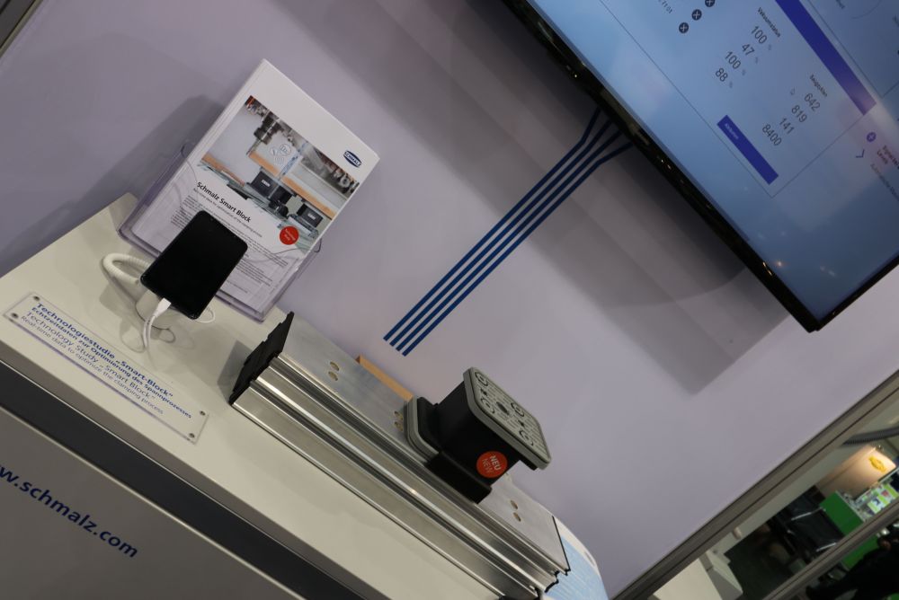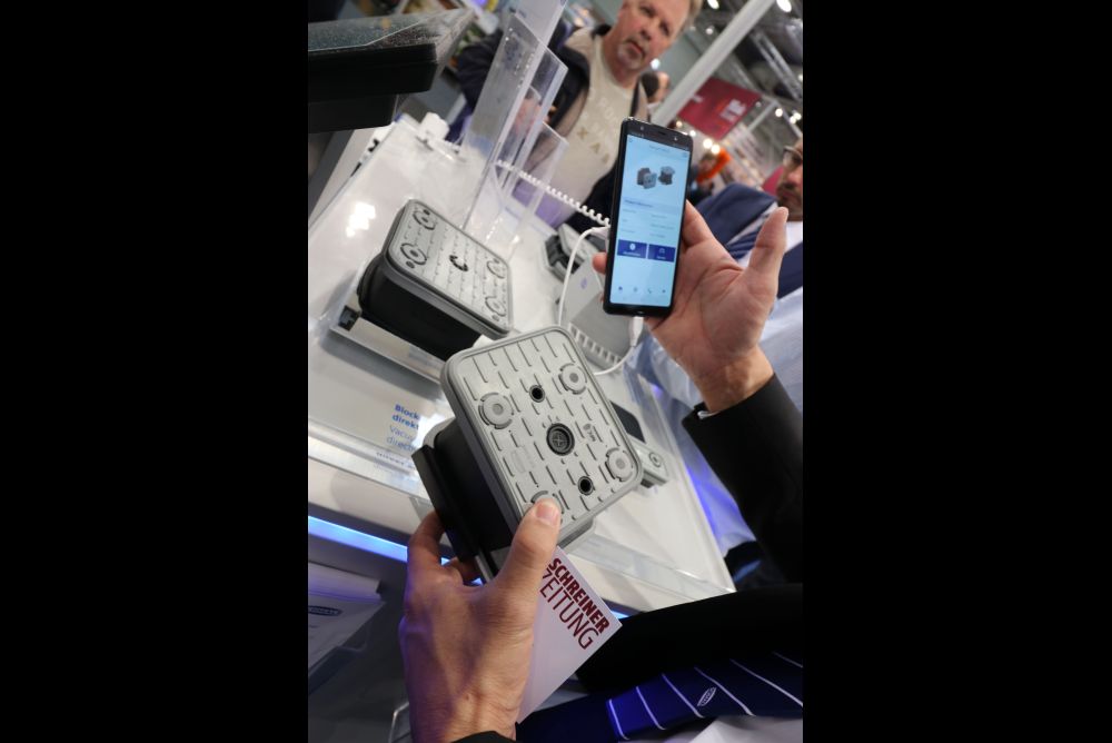 Der Saugerspezialist Schmalz wird seine Sauger laufend mit Chips ausstatten und zeigte einen Prototypen, der sogar seinen aktuellen Zustand der Maschinen mitteilt. Dadurch kann diese immer mit dem höchst möglichen Vorschub fahren und wird dadurch produktiver.
