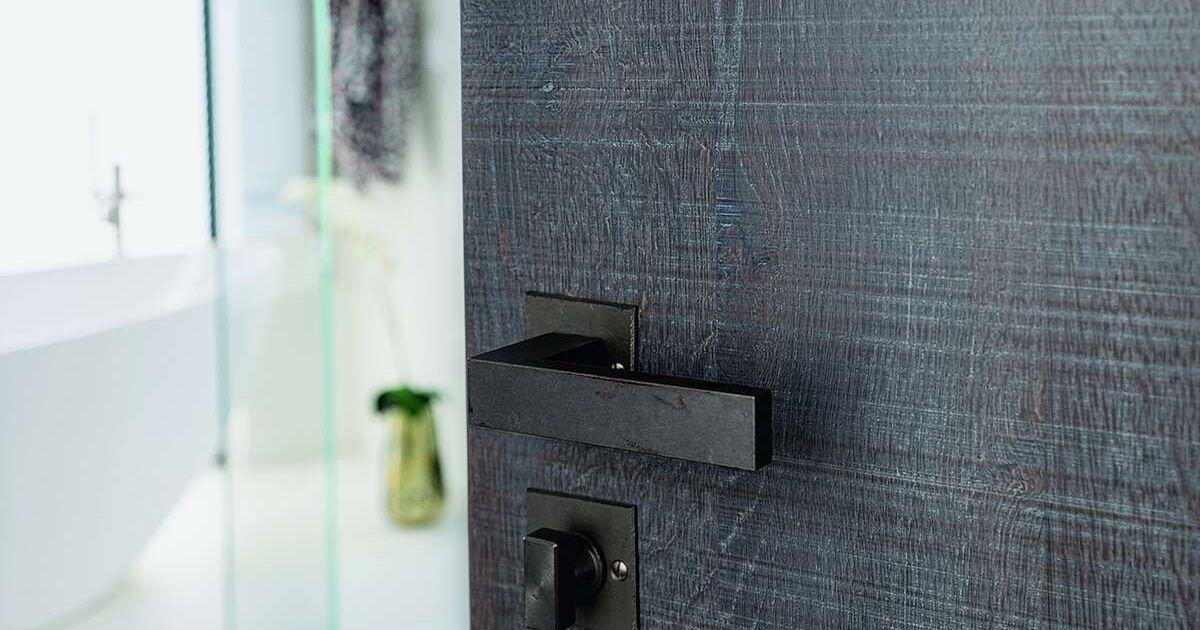 Der Türgriff mit Rosette aus der Serie «Alv» der Firma Hager Zierbeschläge AG wirkt für sich schon sehr kantig. Mit der Oberfläche in Eisen roh und mit Hartöl konserviert, wirkt er wie geschmiedet und passt so ausgezeichnet zu roh und unbehandelt wirkenden Holzoberflächen. Die Serie «Alv» gehört zum rustikalen Angebot der Firma mit der Oberfläche «Schmiedeisen».