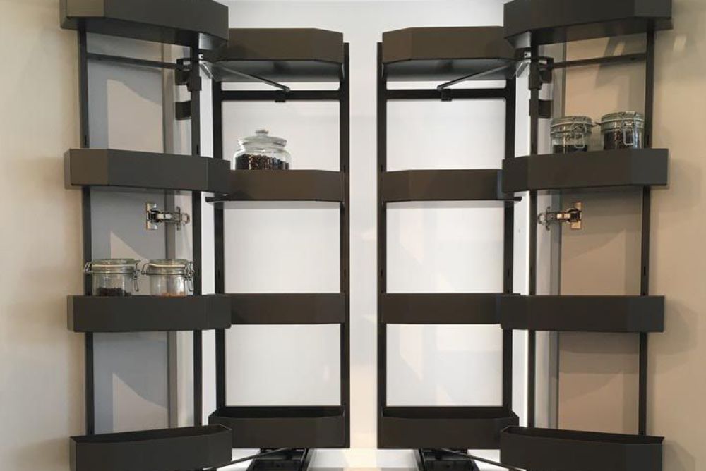 Etwa Schritte hin zu praktischen digitalen Anwendungen in Verbindung mit Licht in Profilen, die mehr können, als nur Licht spenden. Selbstredend das Meiste in Metall, auch bei den Tablaren und Regalelementen, die auf die Profile angedockt werden können. Wie die Beschläge auch, scheint derzeit alles dunkel zu sein. Man hat die Wahl zwischen Grau, Schwarz und Anthrazit. Das gilt auch für die Küche, wo die Ordnungselemente und Auszüge etwas grösser gedacht werden, damit diese auch praktischer in der Handhabung sind.