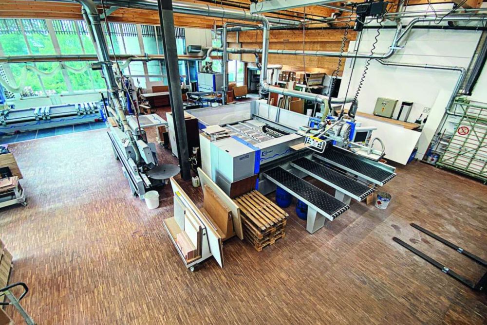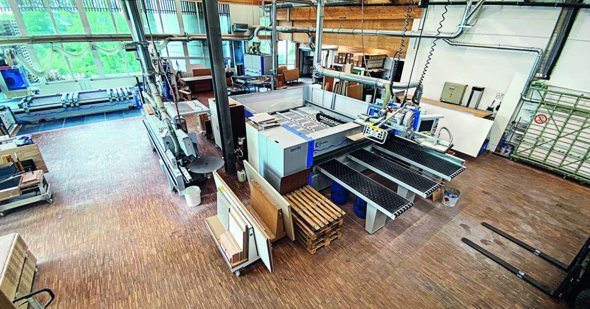 Bei der Schreinerei Stadler AG führt der Produktionsweg im Uhrzeigersinn um die Maschinen herum: Zuerst schneiden, dann Kanten leimen, dann CNC, dann bearbeiten. Bild: Beatrix Bächtold