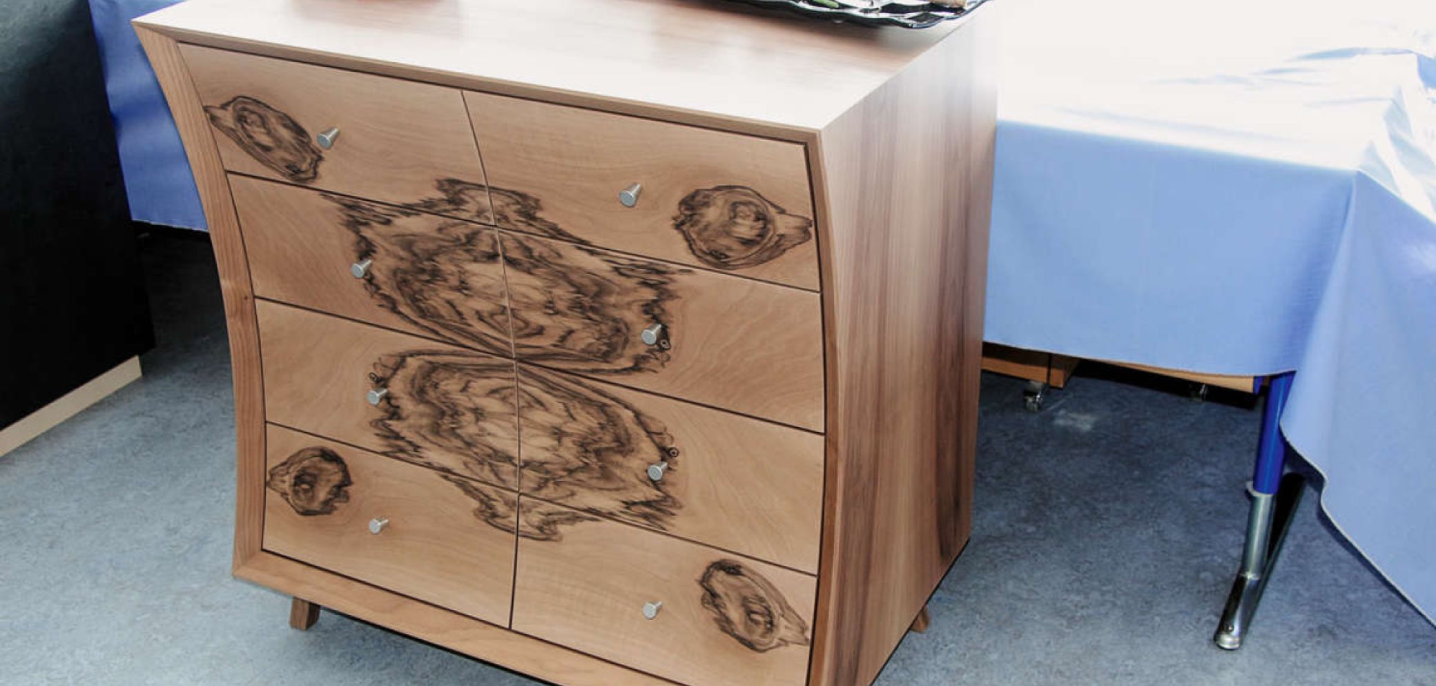Das Rennen machte Christian Städlers Kommode mit der gekrümmten Front. Besonders auffällig war auch Caroline Ramsauers Tisch aus vier Holzarten, mit eingelassenen Muscheln und transparenten Harzbereichen, die fluoreszierend sind.