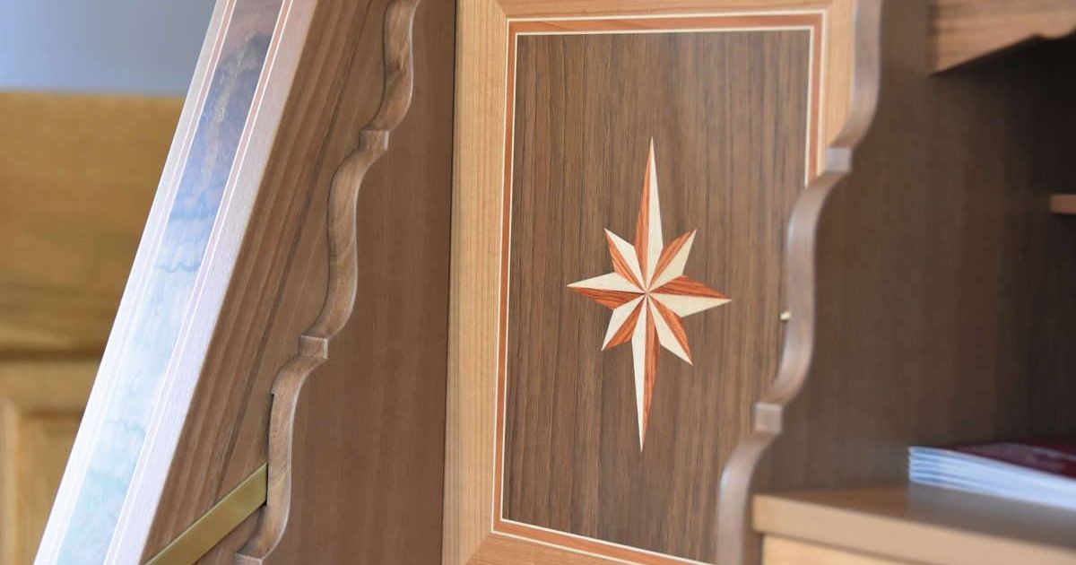 Die Schreiner entwerfen die Intarsien selbst von Hand auf dem Zeichenbrett nach Kundenwunsch. Standardvorlagen oder Lehren verwendet man kaum, nicht einmal für den Stern. «Formen und Masse sind nie genau gleich. Sie müssen auf das jeweilige Möbel abgestimmt sein, damit die Proportionen stimmen», erklärt Michael Koch.