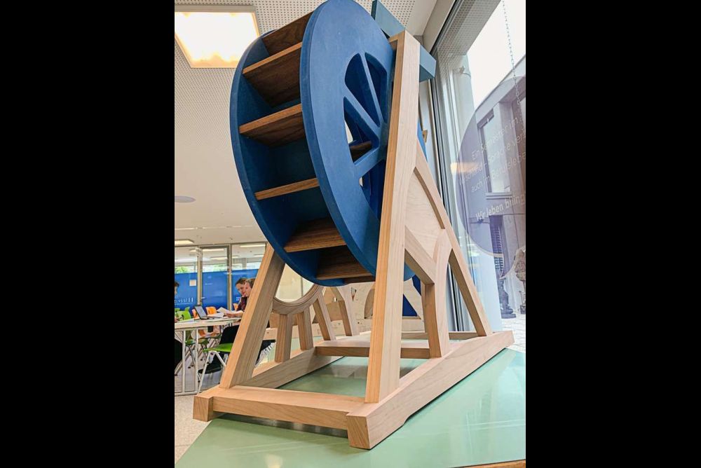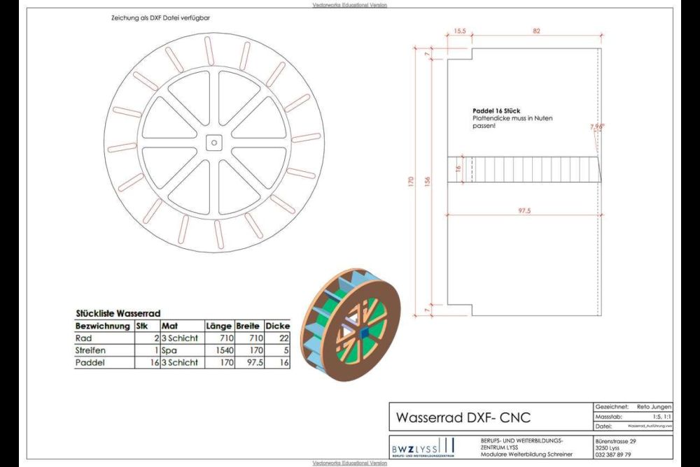 Am Berufs- und Weiterbildungszentrum Lyss, einer Institution des Kantons Bern, können sich Schreinerinnen und Schreiner in Modulen mehr Wissen aneignen. In der Weiterbildung zum Fertigungsspezialisten VSSM/Frecem suchten die Teilnehmer nach einem Projekt, das sie in mehreren Fächern erarbeiten und herstellen können. Dazu gehörten die Modulbereiche Produktionsmittel, Fertigungstechnik, CNC-Programmierung und Bearbeitung sowie Oberflächenbehandlung. Ein uraltes Gerät, nämlich das Wasserrad, gelang in die Ideenrunde und zog schlussendlich die Studierenden und Lehrkräfte des einundzwanzigsten Jahrhunderts in seinen Bann.