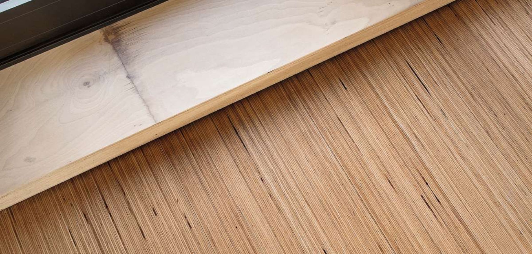Für den Bodenbelag, der auf jeden Fall aus Holz sein sollte, schrieb das Brandschutzkonzept Laubholz mit mindestens 20 mm Stärke vor. Bei ihrer Recherche stiessen die Architekten auf die Baubuche. Aufgrund der hohen Festigkeit und der Härte des Holzes mit einem Brinellwert von 38,2 N/mm2 erfüllt es die geforderten Kriterien und wurde auf allen Stockwerken in den Klassenräumen, den Gängen sowie auf den Treppenläufen verlegt. Baubuche ist ein Furnierschichtholz aus Buchenholz, das vom Hersteller in einem hochtechnologisierten Verfahren hergestellt wird. Dabei werden 3 mm starke Schälfurniere faserparallel respektive kreuzweise verklebt und zu Trägern, Platten, Paneelen und Fussböden weiterverarbeitet.