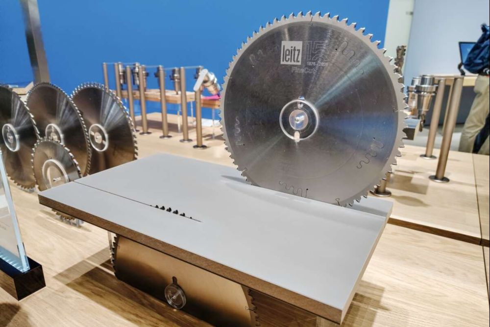 Der Messeauftritt von Leitz stand im Zeichen der 150-jährigen Firmengeschichte. Als Höhepunkt dieses Jubiläumsjahres zeigte das Unternehmen in Nürnberg erstmals das neue «FineCut»-Kreissägeblatt. Das diamantbestückte Werkzeug erlaubt den Plattenzuschnitt ohne Einsatz eines Vorritzers. Die Schneidengeometrie mit ausgeprägt negativem Spanwinkel verhindert Ausrisse auf der unteren Plattenseite auch bei anspruchsvollen Oberflächen und hochverdichteten Werkstoffen.