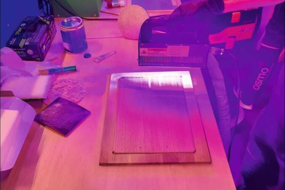 Das «LED Smart-Oil» von Osmo härtet unter UV-Licht in Sekundenschnelle aus. Das Öl wird dünn aufgetragen und danach mit einer Einscheibenmaschine und weissem oder beigem Pad in die Holzoberfläche einmassiert. Anschliessend erfolgt die Trocknung mit einem LED-Strahler im Abstand von 20 bis maximal 100 mm zum Werkstück und einer Handbewegung von ca. 10 m/min. Die fertige Oberfläche ist speichel- und schweissecht sowie geeignet für Kinderspielzeug.