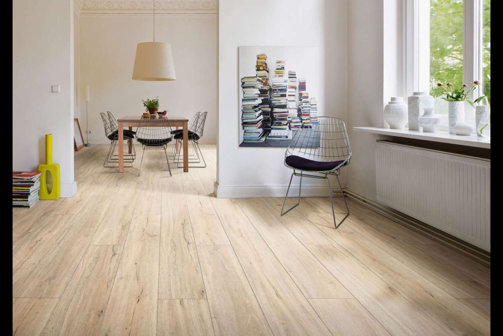 Der Dielenaufbau aus drei aufeinander abgestimmten Schichten bietet hohe Funktionalität. Grundlage ist eine Korkdämmunterlage zur Trittschalldämmung. Darauf liegt die «HydroResist»-Trägerplatte auf Basis von natürlichen Materialien, die feuchteunempfindlich im Vergleich zu herkömmlichen Trägerplatten aus Holzwerkstoffen ist. Den Abschluss bilden zwei Lagen der «SilentSense»-Oberfläche in Holzoptik. Diese ist elastisch und angenehm warm, schützt den Boden und verleiht ihm Strapazierfähigkeit bei einfacher Pflege. Bei intensiver Sonneneinstrahlung bleibt er formstabil und dehnt sich nicht aus.