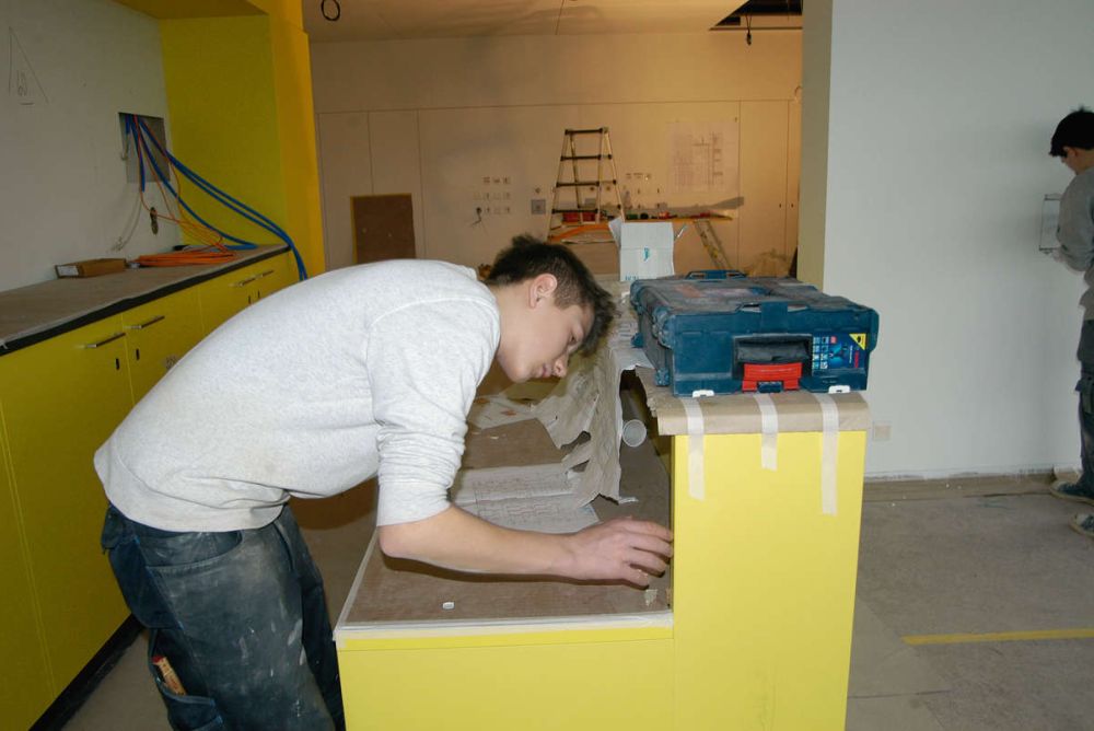 Merlin und die anderen drei Schreinerlernenden unterstützen die Wefi-Mannschaft bei den umfangreichen Arbeiten, wo sie können. Während Merlin heute beispielsweise im Spital vor Ort ist, schraubt Robin Blumenstein, Lernender im 4. Lehrjahr, in Bad Zurzach Schubladen für die Montage zusammen. «Die Aufgabe heute ist reine Routinearbeit, aber morgen bin ich wieder an einem anderen Posten eingeteilt», grinst der 19-Jährige.