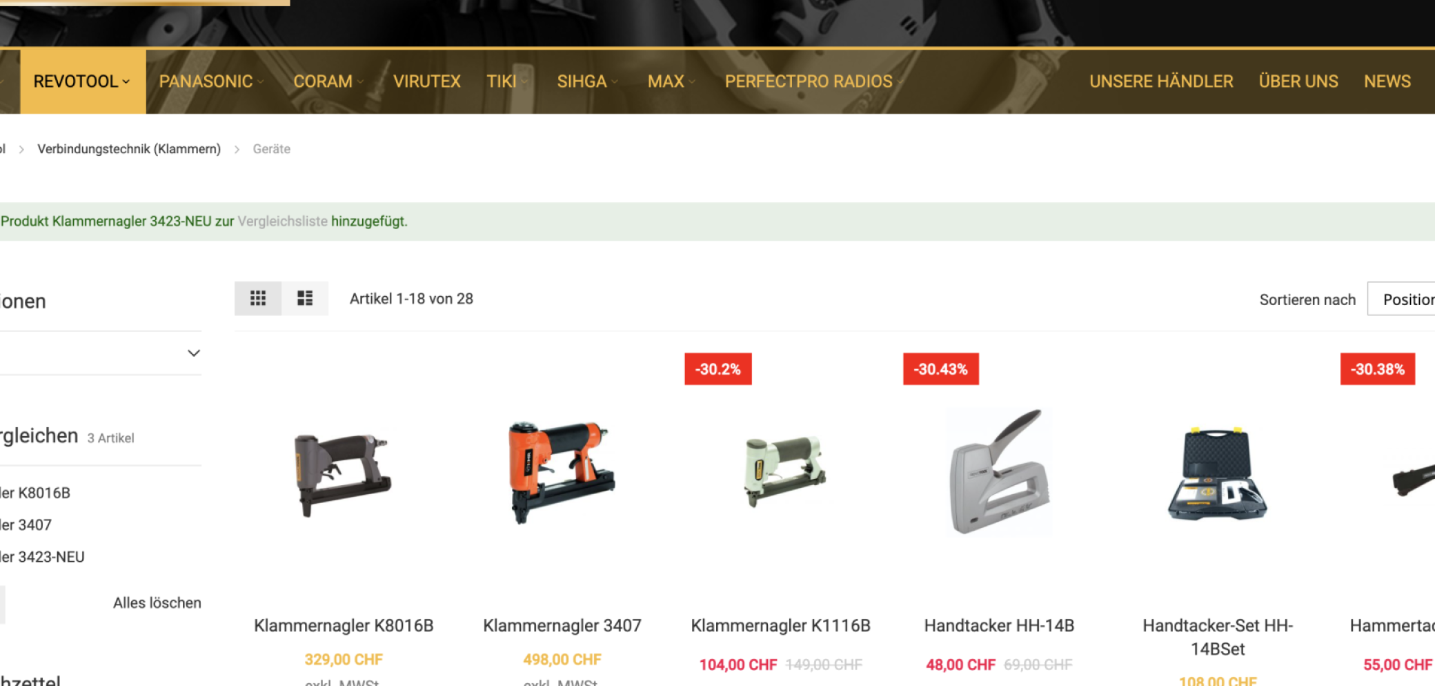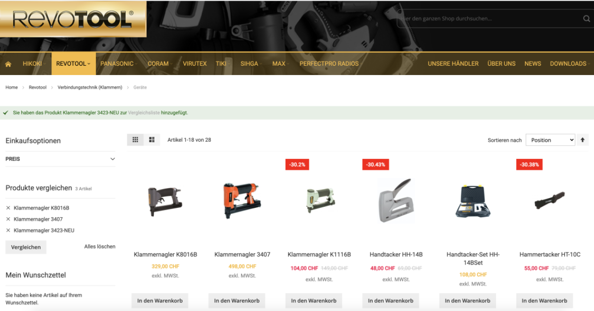 Die Firma Revotool feiert 2021 ihr 30-jähriges Bestehen, wie es auf deren Website heisst. Die Website ist zugleich Webshop, in dem alle Produkte angeschaut und bestellt werden können. Bei Revotool finden Profis Arbeitsgeräte, Werkzeug, Zubehör und Verbrauchsmaterial für den Bau und die Montage. Neben der Eigenmarke Revotool werden Produkte von Hikoki, Panasonic, Coram, Virutex, Tiki, Sihga, Max und Perfectpro Radios angeboten.