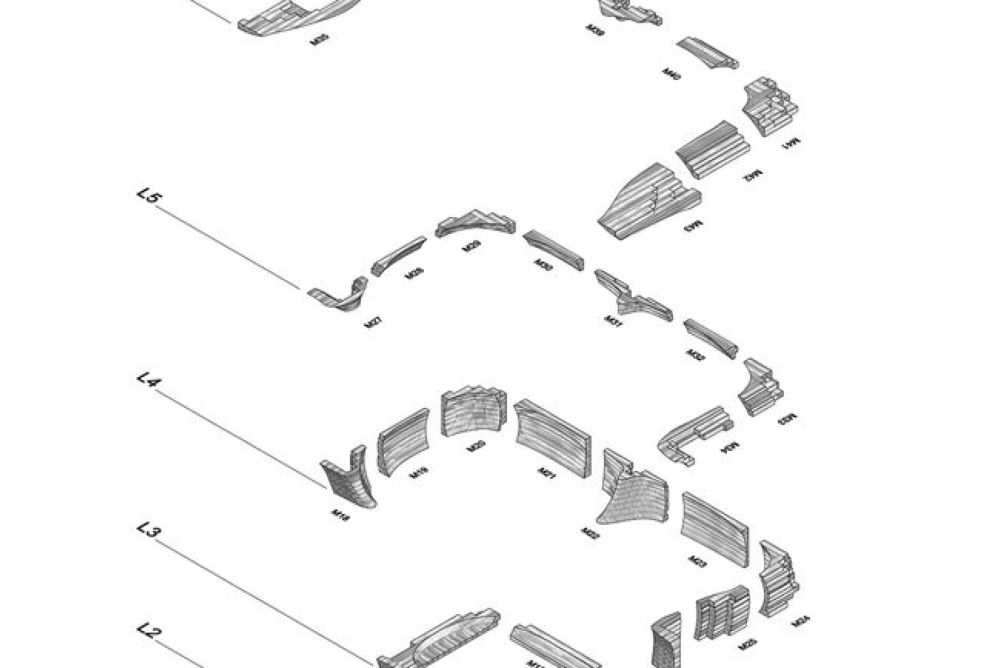 Die geschwungene Wand und die Plattform, die sich um die Rückseite der Suite windet, bestehen aus 1'112 Fichtenholzstücken. Ein Algorithmus-basierendes Computerprogramm zeichnete die verschiedenen Holzstücke. Vor Ort wurden diese dann von den zwei Architekten des Studios, Apostolos Mitropoulos und Thanos Zervos, welche sich auf Holzbau und Schreinerarbeiten spezialisiert haben, zugeschnitten. Die Einzelstücke wurden dann zu 55 grossen Modulen zusammengesteckt, weiter von Hand bearbeitet und schliesslich in die Höhle eingefügt. Die Bodenbretter, die Schränke der Küchenzeile und der von der Wand ausgehende Esstisch wurden aus astfreiem Kiefernholz gefertigt.