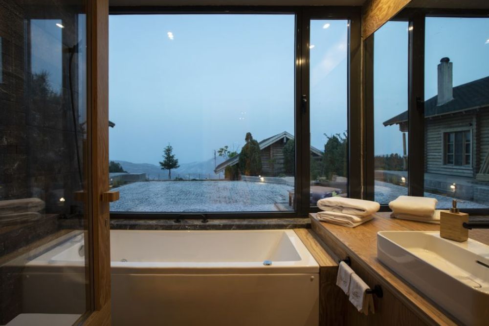 Die «Wooden Cave» ist in zwei Hälften geteilt: Die hintere höhlenartige Hälfte ist fast vollständig aus Holz und weist sanft geschwungene Wände auf. Die vordere Hälfte der Suite ist in linearen Formen, die mit aschfahlen schwarzen Fliesen ausgelegt sind, gehalten.