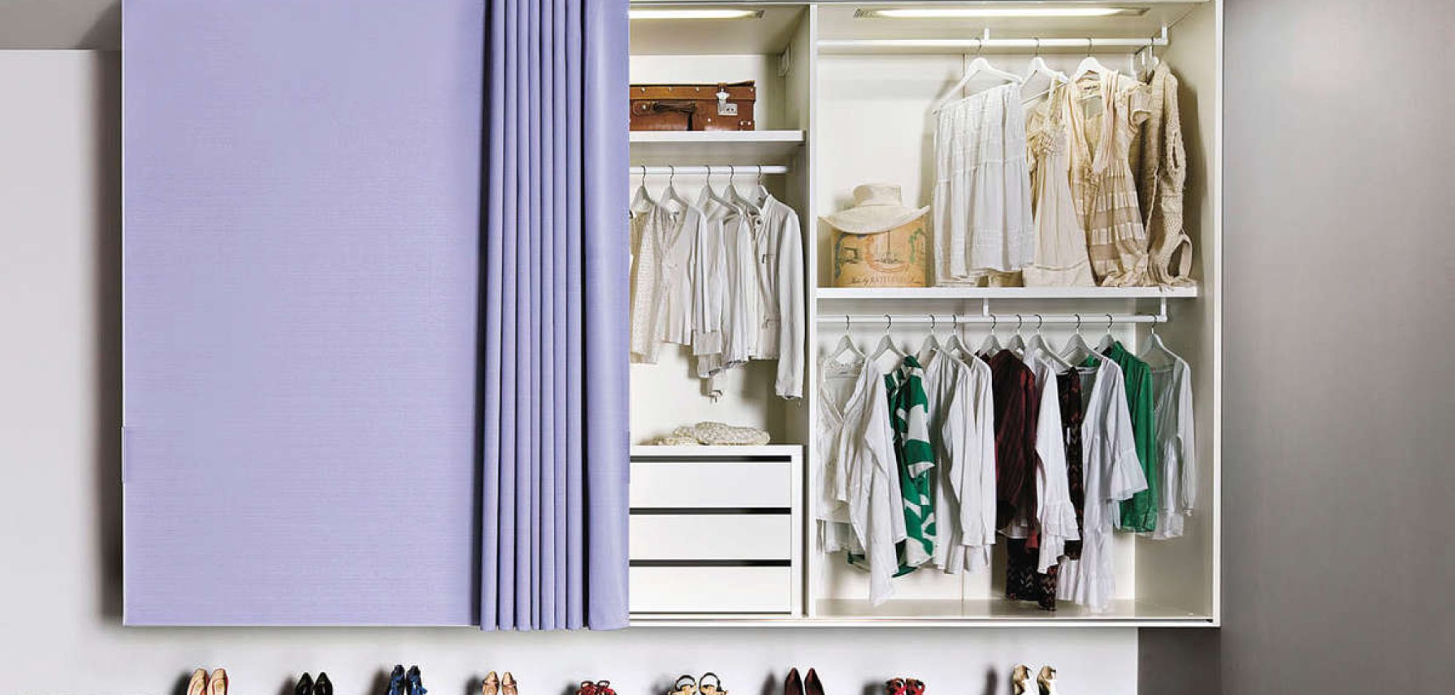 Anche i mobili giocano un ruolo di primo piano come le lampade con il paralume imbottito o con la superficie a forma di «contenitori per uova» ripetuti all’infinito. Ha proprietà fonoassorbenti, ed è in grado quindi di creare un ambiente ovattato, il sistema di armadiature «Et Voilà». Nato dalla matita di Daniele Lago per Lago, introduce nuove modalità di fruizione del mobile: il tessuto elimina l’anta, permettendo di coprire ampie superfici e, grazie alla riduzione di peso dovuta al minor impiego di pannellature, di sospendere a parete anche un armadio. La versione «Weightless» è un armadio leggero e costituisce un’alternativa all’armadio tradizionale soprattutto in camere da letto di dimensioni ridotte. «Et Voilà» è applicabile sia alla zona notte sia alla zona giorno. Può essere declinato a seconda dell’ambiente nel quale è inserito, e permette la massima libertà di espressione: basta sostituire la fantasia del tessuto o i colori e la casa acquista subito un volto nuovo. Il tessuto monocolore si presta a mimetizzarsi con l’ambiente, facendo quasi scomparire l’armadio, mentre il tessuto a righe lo rende protagonista della stanza. Il tessuto è unico nel suo genere ed è caratterizzato da un elevato grado d’idrorepellenza contro le macchie da liquido. La capacità di fermare l’umidità impedisce la formazione di funghi, batteri e acari, mentre la fitta tessitura antistatica previene il passaggio della polvere.