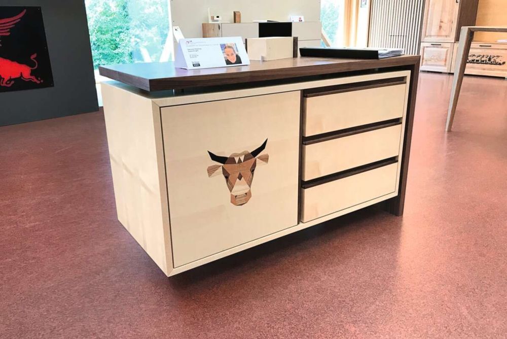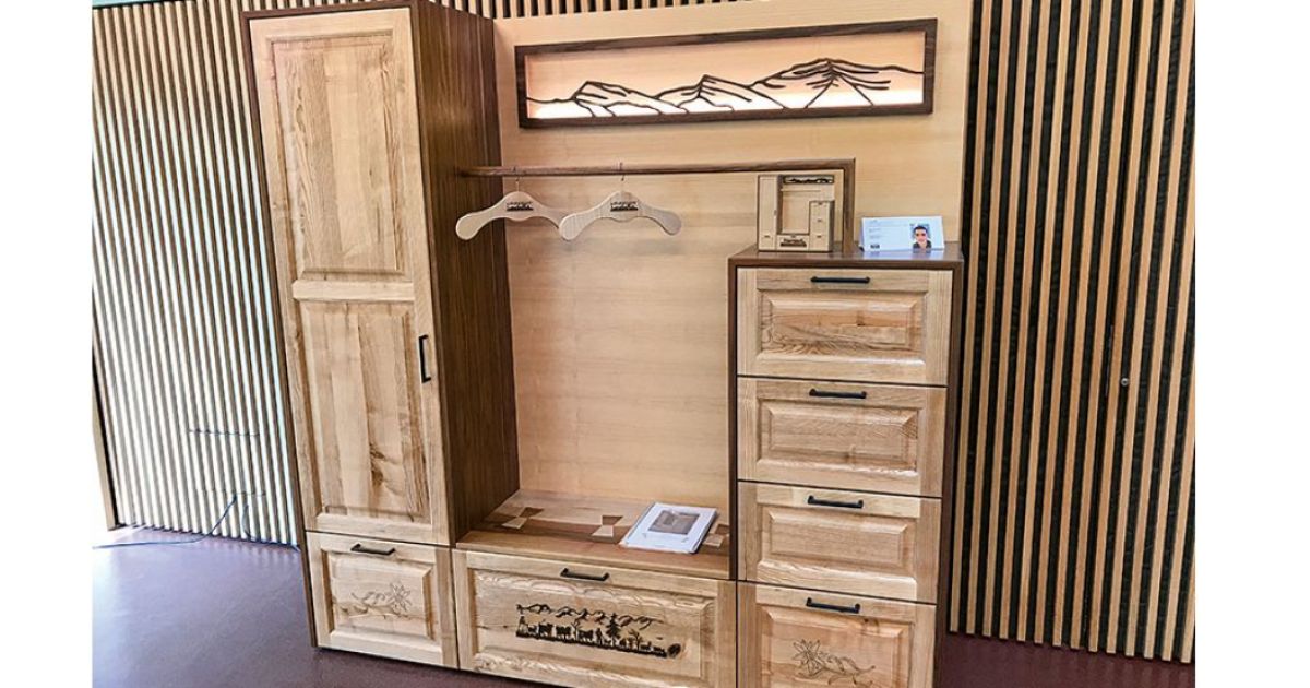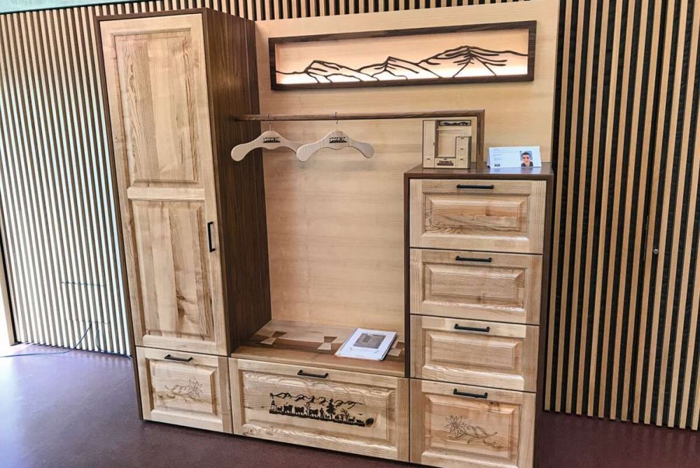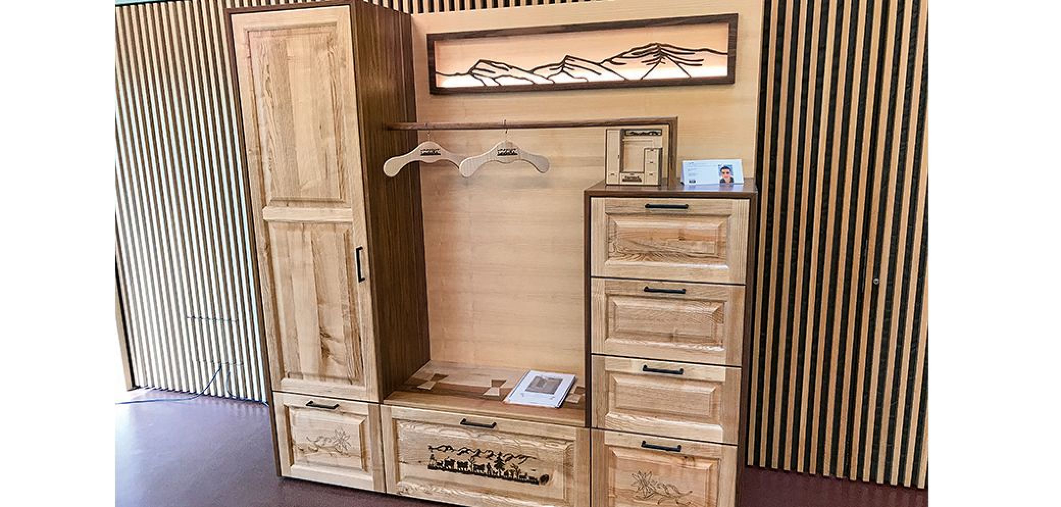 Für das Innenleben seiner Garderobe verwendete Tim Zweifel weiss beschichtete Spanplatten. «Die Schubladen furnierte ich mit Riegel-ahorn. Die Sichtseiten bestehen aus Nussbaum furnierter Spanplatte. Die Rückwand habe ich mit Eschenholz furniert», beschreibt er. Die geschwungene Ablage in der Mitte besteht aus massivem Nussbaum- und Eschenholz. Zudem seien die gestemmten Fronten komplett aus massiver Esche. «Die Idee war, die Kombination aus Nussbaum- und Eschenholz zum Vorschein zu bringen und verfliessen zu lassen.» Bei den gestemmten Fronten produzierte er das sogenannte Konterprofil. «Ich fräste ein Profil an die Friese und produzierte anschliessend exakt das Gegenprofil. Die Füllungen habe ich abgeplattet und eingenutet.» Die grösste Herausforderung waren die gestemmten Fronten, da er solche noch nie gemacht hatte. «Zudem arbeiten wir mehr mit Plattenmaterialien als mit Massivholz.» Ein zweiter grosser Punkt war, die Berge aus der Region einzulasern. «Ich bin sehr zufrieden und stolz, gewonnen zu haben.»