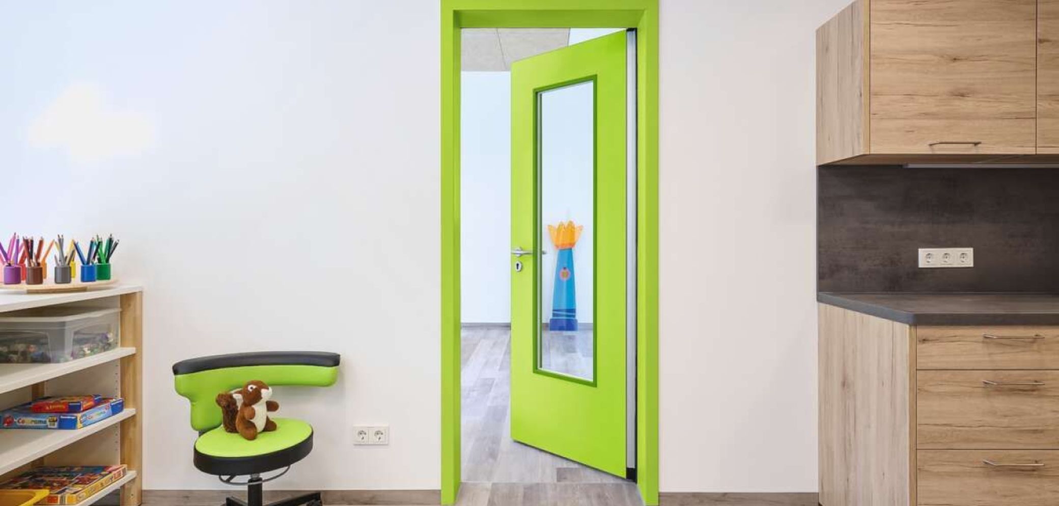 Die Schörghuber Fingerklemmschutz- tür «Super Secure» erfüllt hohe Design- ansprüche und bietet maximale Sicherheit dort, wo sich schutzbedürftige Personen aufhalten: in Kitas, Schulen, Pflege- und Gesundheitseinrichtungen. Die hohe Sicherheit beruht auf der Integration des speziellen Band- und Dichtungssystems direkt in Zarge und Türblatt. Dadurch entsteht an der Nebenschliesskante kein Spalt. Ein Eingreifen und damit Quetschen der Finger ist somit auf beiden Türseiten über die gesamte Türblatthöhe nahezu unmöglich. Neu hinzugekommen ist der verdeckte Kabelübergang, der im Fingerklemmschutzsystem integriert ist. Dadurch ist die Montage von beispiels- weise einem automatischen Türantrieb möglich – besonders in Bereichen, in denen Barrierefreiheit erforderlich ist. Darüber hinaus erfüllt die Fingerklemmschutztür durch eine integrierte Auslösung der Absenkdichtung einen Rauch- und Schallschutz bis zu 37 dB sowie Barrierefreiheit. Neben der einflügligen Variante ist die Tür auch in einer zweiflügligen Ausführung erhältlich, die wahlweise mit Holz- oder Stahlzargen kombiniert werden kann. Für mehr Transparenz wurde das Sortiment um Türelemente mit Oberlichtern, Seitenteilen aus Glas sowie Festverglasungen erweitert.