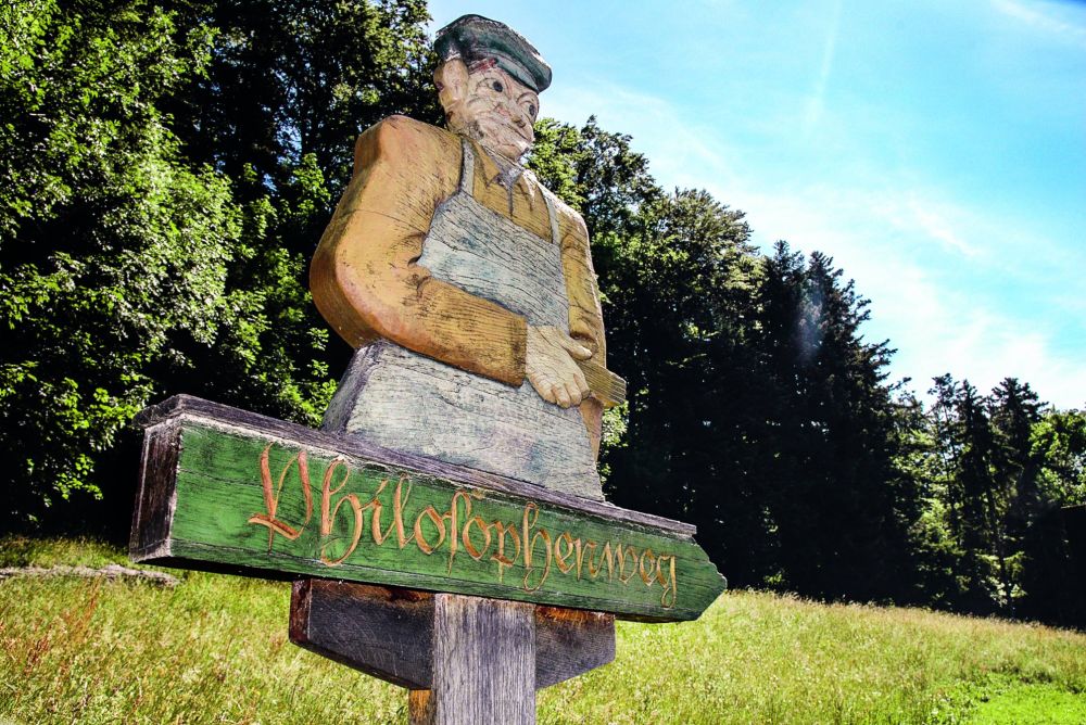 Lange war der Weg eine Schotterstrasse, ab Ende der 1980er-Jahre war er mit Strassenleuchten versehen, die aber mithilfe von Sturm Lothar wieder abmontiert wurden. Ein Fixpunkt auf dem Weg war viele Jahre ein Berufskundebaum, von der damaligen Schreinerkoryphäe Josef Brunschwiler fotografiert und im Materialkundeunterricht immer wieder besprochen. So weiss jeder «alte» Schreinermeister aus eigenem Betrachten der inzwischen gefällten Tanne, dass sie auf der unteren, runden Seite Druckholz (Buchs) gebildet hatte (Materialkunde für Schreiner, 1966). Dieses Wissen hat heute bei den vielen neuen Materialien, die Schreiner verwenden, an Bedeutung verloren. Mit dem Wegweiser «Philosophenweg», der einen Schreiner mit Doppelmeter in der Hand darstellt, setzten die Schreiner «ihrem» Weg ein Denkmal. Heute noch wird der Philosoph alle paar Jahre restauriert.
