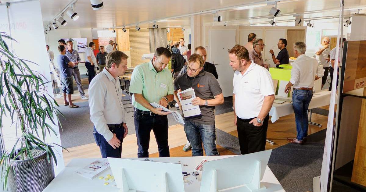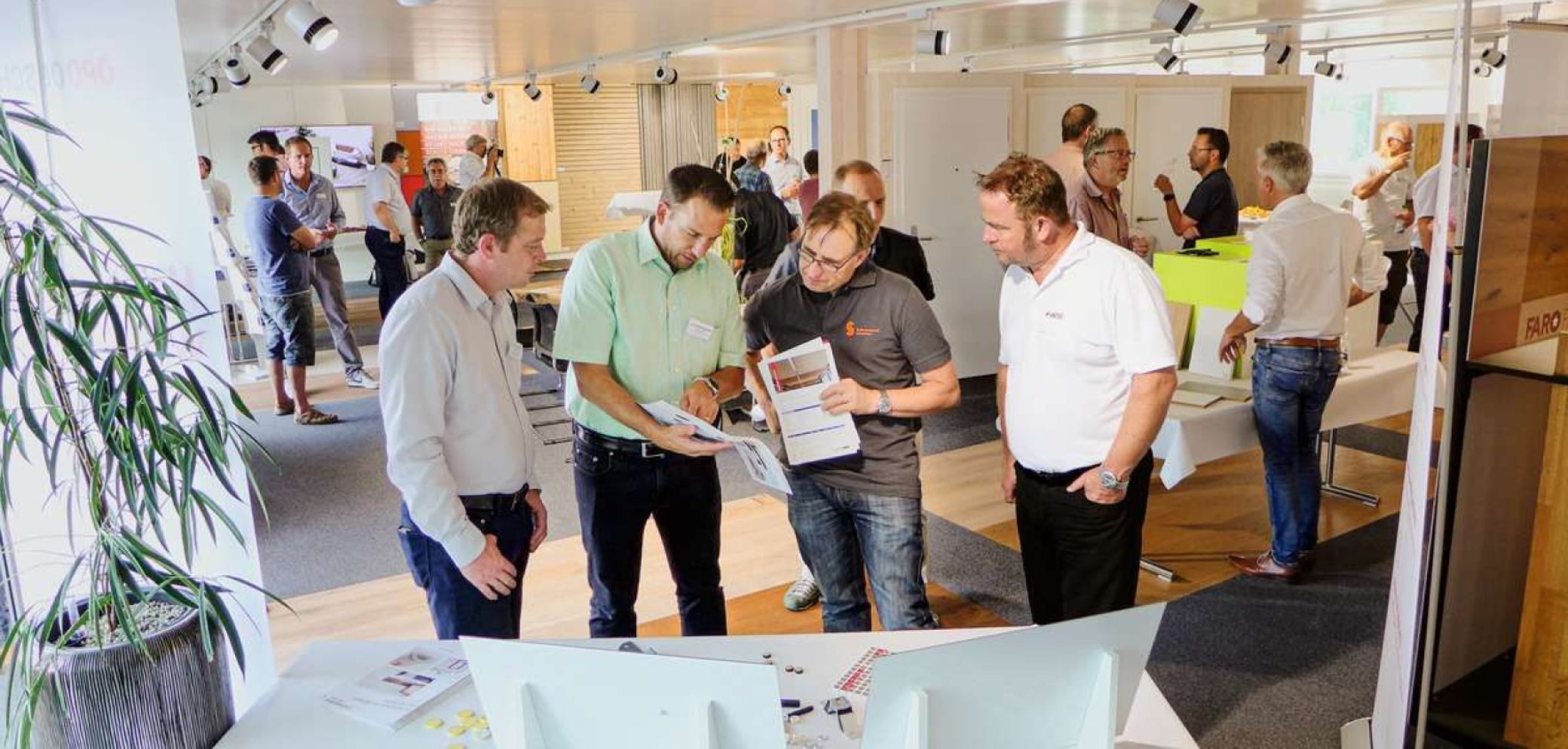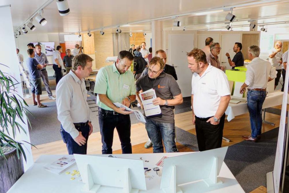 Die Schreiner konnten das Gehörte gleich anhand von passenden Produkten vertiefen. Bild: Andreas Brinkmann