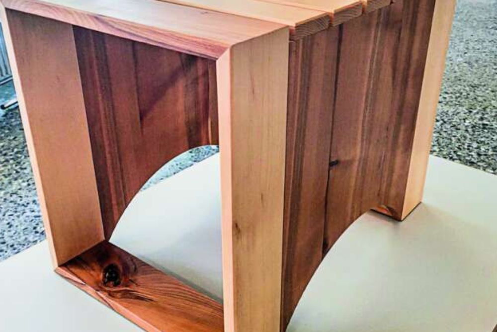 Das Objekt besteht aus acht verschiedenen Hölzern: Das Gestell aus Fichte (alte Akustik-Dreischichtplatten), die Sitzfläche aus Teilen von Eiche, Sipo, Ahorn, Esche, Birnbaum, Tulpen- und Teakholz. «Da kein Teil des Sitzes rechtwinklig und gerade war, habe ich alle verleimt und auf der Maschine gerade geschnitten. Dann wieder zusammengeleimt und die schönste Fläche ausgeschnitten.»