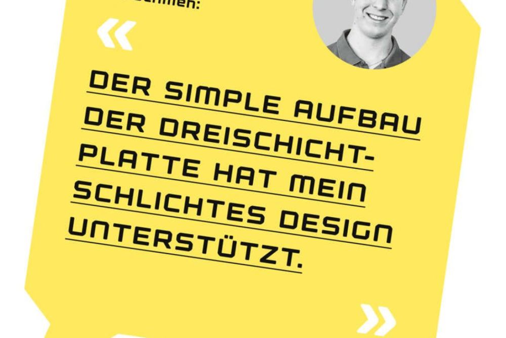 Till Schmeh, der bei der Bimag AG in Wald ZH angestellt ist, kommt selber auf Nachfrage zu Wort: «Ich wollte von Anfang an einen schlichten Hocker haben, daher habe ich ein einfaches Design gesucht und entworfen.» Er hatte verschiedene Ideen, die er von Hand skizziert hat. Das finale Design hat er dann im CAD gezeichnet und aus Karton ausgelasert. Das Modell habe ihm gezeigt, dass seine Idee umsetzbar sei. «Ich verwendete Dreischichtplatten aus Fichte, da der simple Plattenaufbau mein schlichtes Design unterstützt», beschreibt Schmeh. Das Zuschneiden, Bearbeiten und Verleimen der verschiedenen Teile sei ohne grössere Probleme verlaufen.