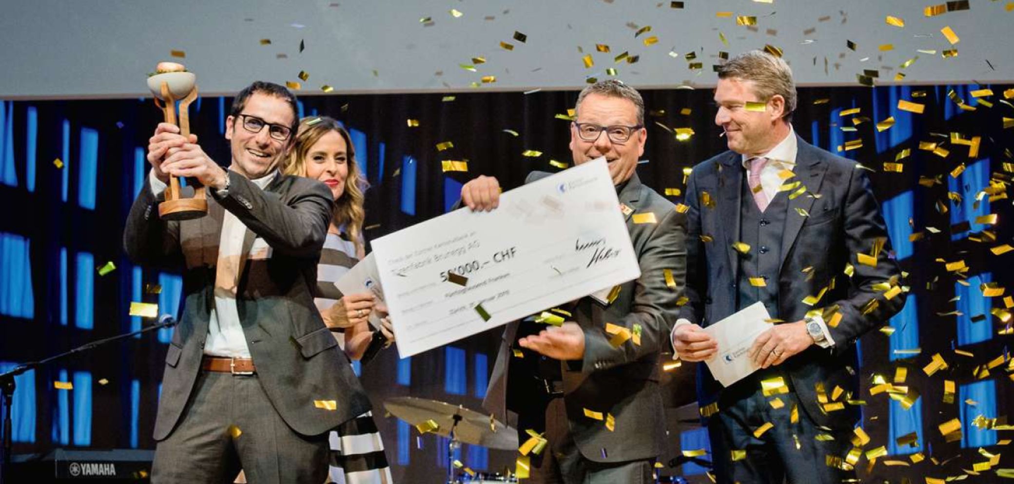 Für die Türenfabrik Brunegg nahmen die Geschäftsleitungsmitglieder um CEO Martin Eisele (mit Pokal) und Finanzchef Markus Strebel (mit Scheck) den Preis entgegen.