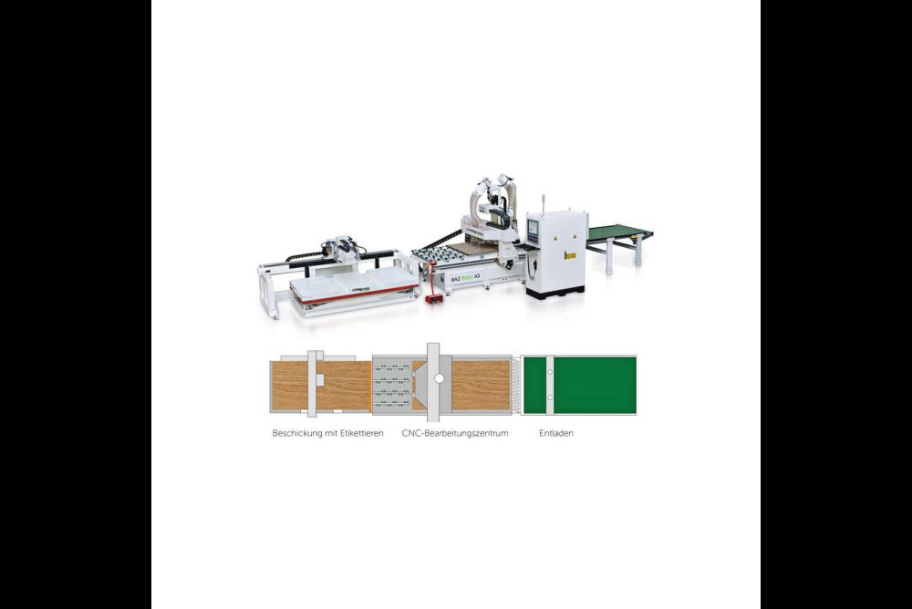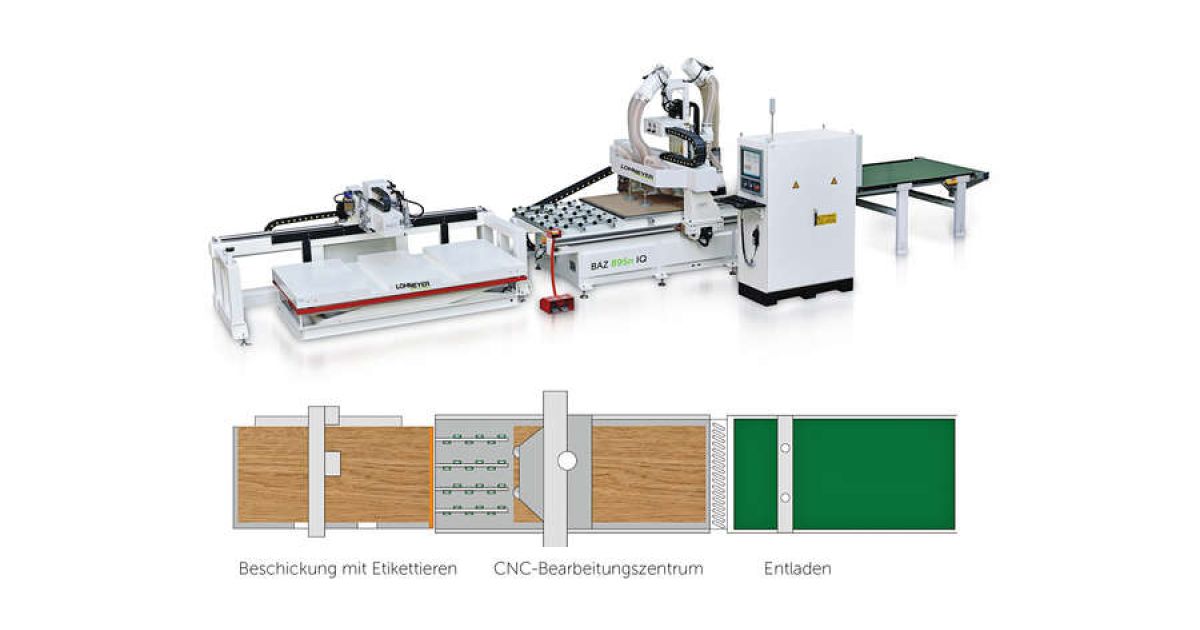 Lohmeyer bietet eine vollautomatische, komplette Nestinglinie mit Barcodedrucker und Handling für Halbformatplatten an. Ein hydraulischer Hubtisch mit 3000 kg Traglast hebt die Platten auf die Ebene des Etikettierens, transportiert sie und richtet sie automatisch auf die kor-