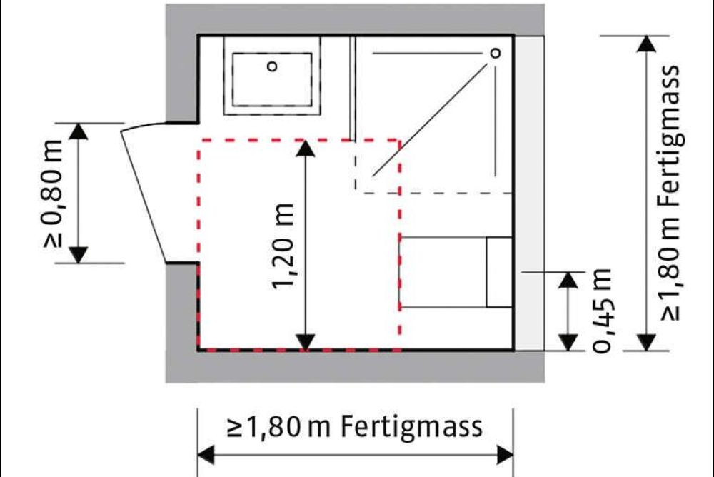 Diese Freiflächen sind in ihren minimalen Abmessungen definiert, damit an die jeweiligen Apparate herangefahren und vom Rollstuhl aus transferiert werden kann. Bei geschickter Anordnung der Apparate können die erforderlichen, sich überlappenden Freiflächen auch einen relativ kleinen Raum zulassen. Schon ein Raum von 1,8 mal 1,8 Meter lässt sich mit WC, Lavabo und Dusche zu einem geeigneten Sanitärraum ausstatten. Er schliesst allerdings die Möglichkeit einer Badewanne aus. Bei der in diesem Fall erforderlichen Freifläche von mindestens 1,2 mal 1,2 Meter darf absolut nichts hineinragen. Duschtrennwände sind daher oft nicht einsetzbar. Vorhänge bieten dagegen einiges mehr an Flexibilität. Es lohnt sich zudem, schon bei der Raumplanung stabile Befestigungszonen für später notwendige Haltevorrichtungen einzuplanen und sehr gut zu dokumentieren.