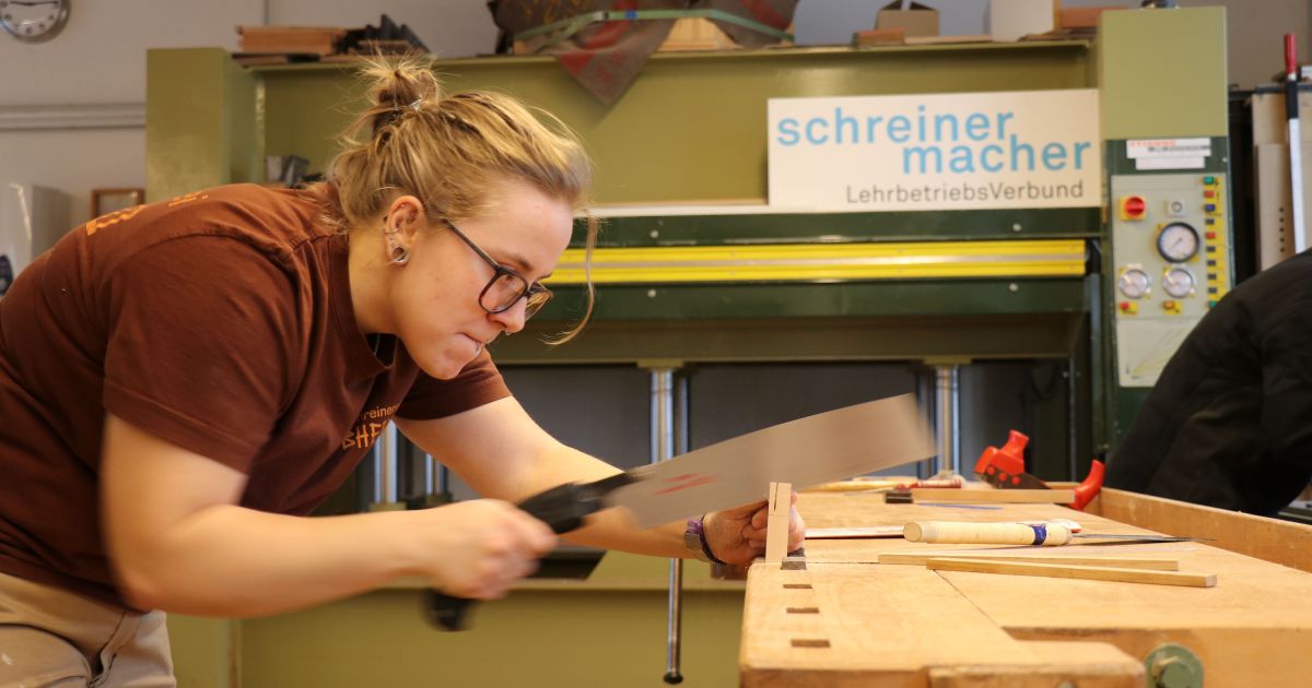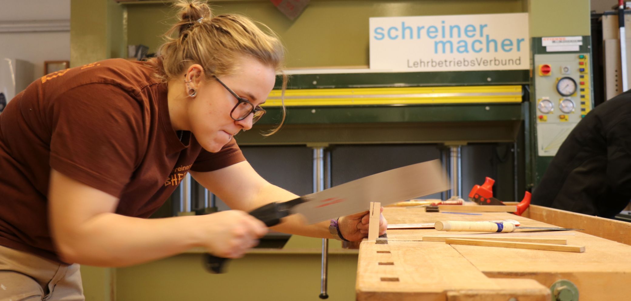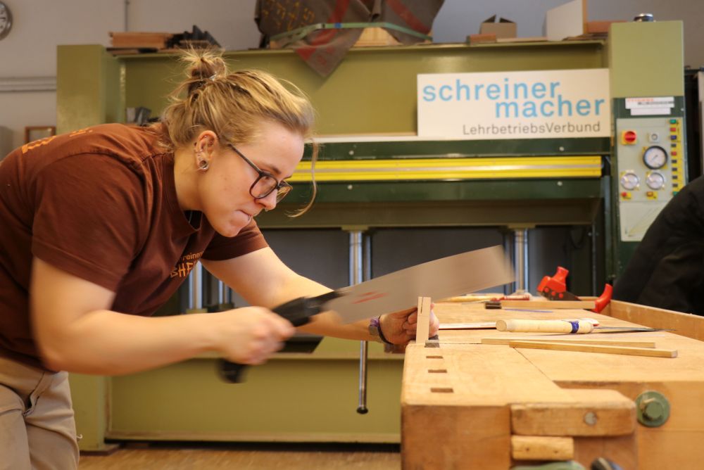 Pläne runterladen und loslegen: Eine Lernende arbeitet am Papierrollen-Halter. Bild: Schreinermacher