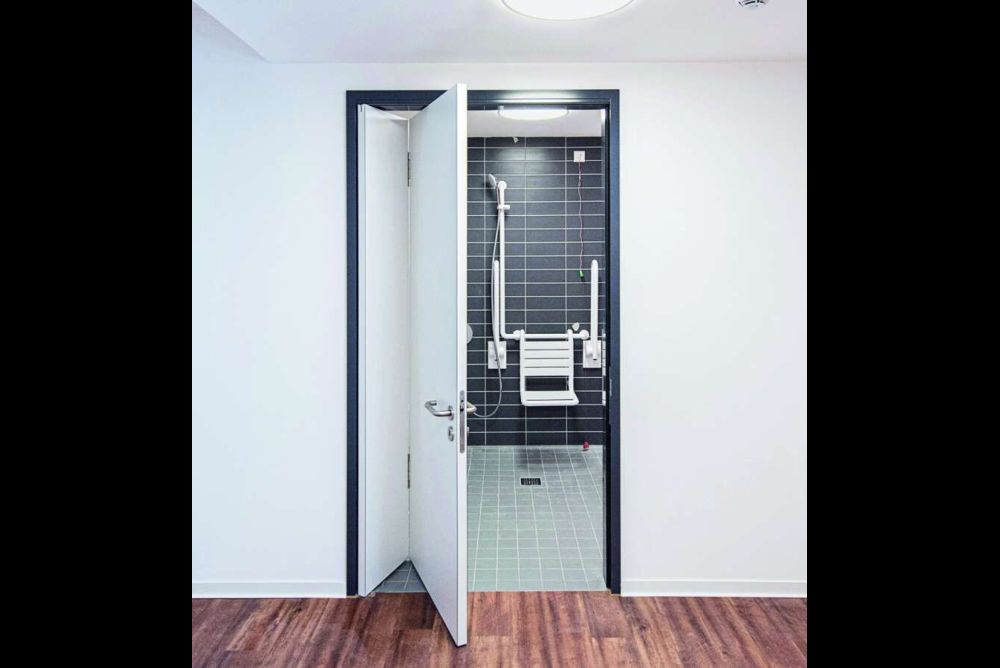 Die Raumspartür von Küffner scheidet bezüglich Kraftaufwand, Motorik und Bewegungsflächen bei der Benutzung im Zusammenhang mit Rollator oder Rollstuhl besser ab als herkömmliche Drehflügel- oder Schiebetüren. Zudem entwickelt der Hersteller die Türkonstruktion stets weiter. Die als «barrierefrei» zertifizierte Tür erhielt neuartige Edelstahlbänder mit einer Notöffnungsfunktion. Damit erreicht die «Raumspartür» in der Dauerfunktionsprüfung über 500 000 Öffnungszyklen. Auch Bewohnern mit kognitiven Einschränkungen und demenz- erkrankten Menschen bleibt der Bedienungsablauf vertraut – im Vergleich zur ungewohnten Nutzung einer Schiebetür. Ein Umdenken ist nicht erforderlich. Die Betätigung des Drückers zum Öffnen und Schliessen der faltbaren Raumspartür ist vergleichbar mit der einer herkömmlichen Drehflügeltür. Der entscheidende Vorteil ist zudem der geringere Platzbedarf. Ein aufwendiges und unfallträchtiges Manövrieren mit Rollator oder Roll- stuhl entfällt dadurch. Der Türdrücker ist bei geöffneter Tür von beiden Seiten des Durchgangs stets in erreichbarer Nähe.