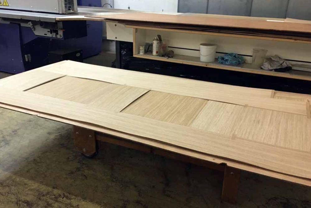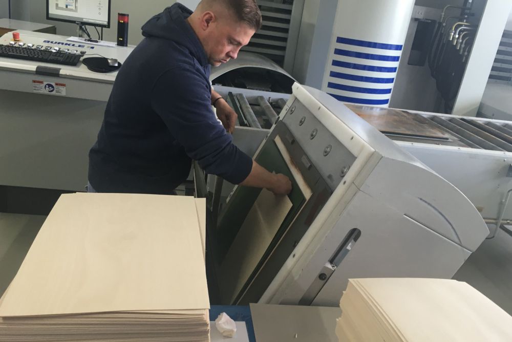 Ungewöhnlicher Einsatzort für Furnier: Das Furnier für «Oscards» wird in der Druckerei zunächst heiss gepresst. Bild: Christian Härtel