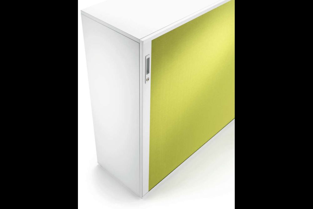 Als Breitbandabsorber der Absorberklasse B schluckt die Rollladenmatte laut Hersteller in Kombination mit dem Schrank bis zu 80 % des störenden Schalls und fördert konzentriertes Arbeiten. Ein weiterer Vorteil ist die Platzersparnis: Gegenüber Flügeltüren halten Rollladenvarianten bis zu 30 % mehr Raum frei. Und ihre Nutzer haben mit einer Handbewegung freien Zugriff auf den gesamten Schrankinhalt.