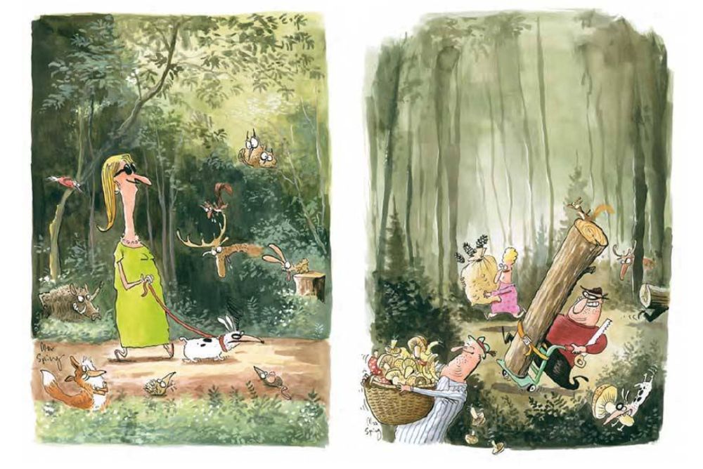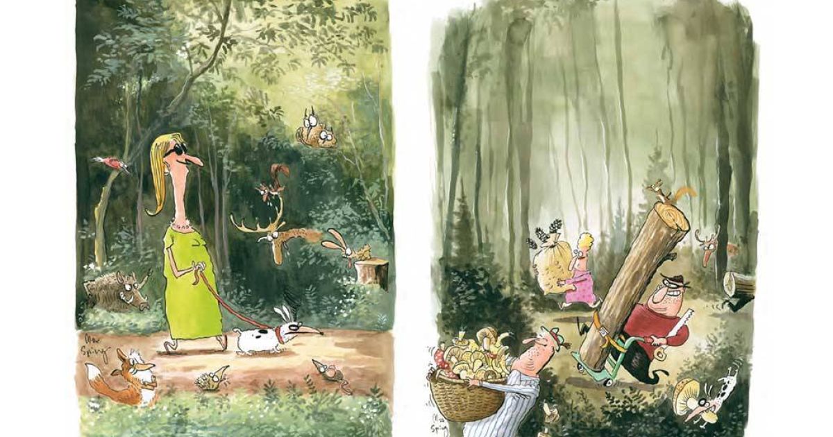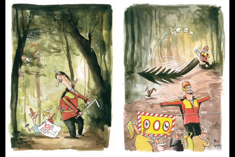 «Alle Verhaltens-Tipps sind positiv formuliert; denn wir wollen nicht mit dem Zeigefinger auf die Waldbesuchenden zeigen, sondern durchaus mit einem Augenzwinkern mit dem Wald-Knigge zu einem friedlichen Nebeneinander beitragen», sagt Regina Wollenmann und nimmt damit Bezug auf die Cartoons, die im unverkennbaren Stil von Max Spring humorvoll zugespitzt gezeichnet wurden.