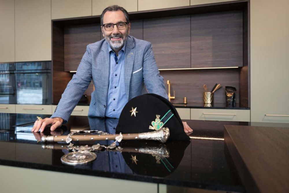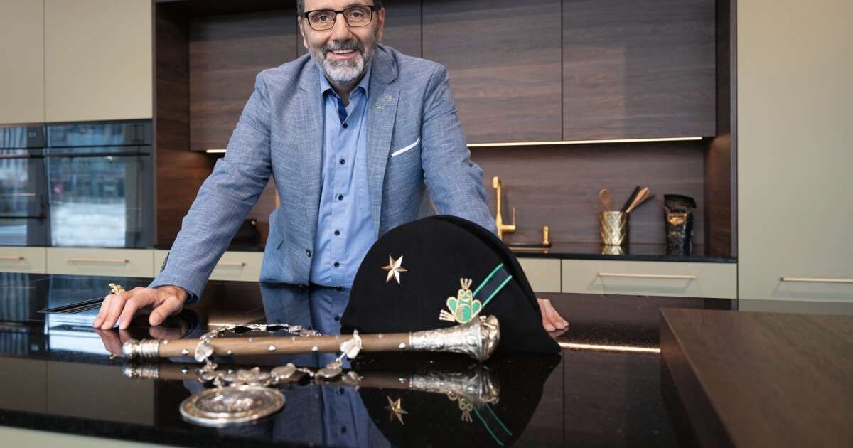 Zunftmeister Ivan Wey (52) posiert mit den Insignien seines neuen Amts an der Luzerner Fasnacht. Bild: Caroline Mohnke