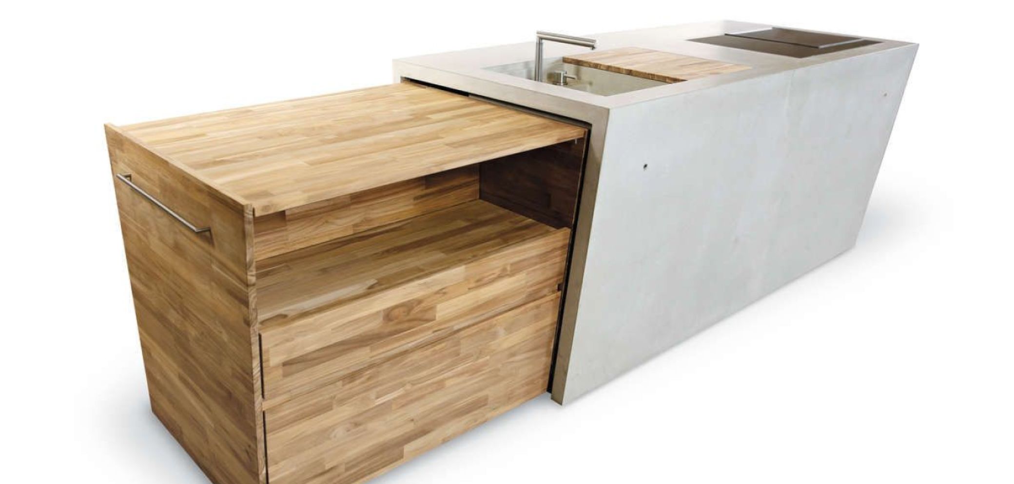 Die kompakte Aussenkochstelle ist eine vollwertige Küche mit Wasseranschluss, Boiler, Spülbecken, einem Induktionsherd oder einer gasbetriebenen Plancha sowie Kühlschrank und Abfalleimer. Genügend Stauraum für Kochutensilien befindet sich in einem seitlich aus der Küche herausziehbaren Trolley aus massivem Teak. Als mobiles Element ist dieser immer dort am Platz, wo er gebraucht wird. Alternativ wird er auch in Corian gefertigt. Aufgeklappt bietet der Trolley eine zusätzliche Arbeitsfläche. Bestecke und Servietten können griffgünstig in einer flachen Schublade verstaut werden.