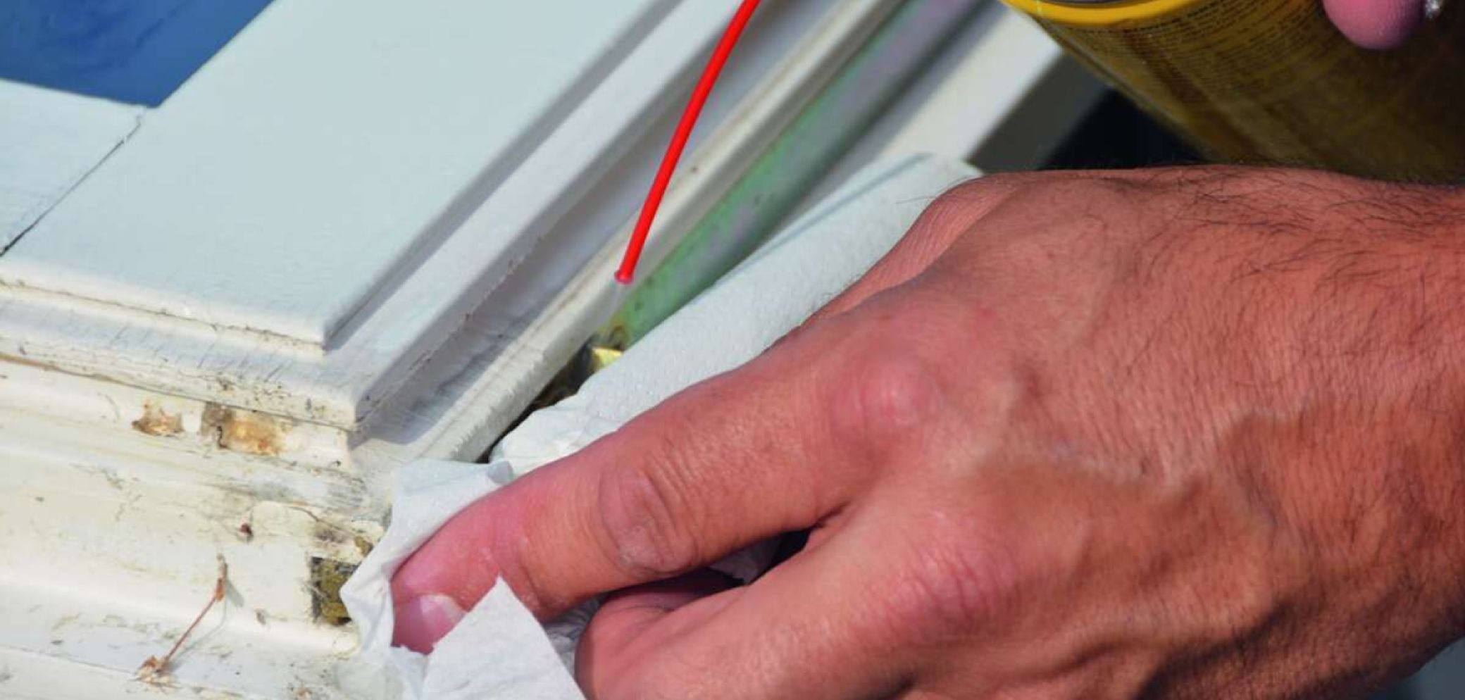 Wartung eines Holzfensters, zu der auch das Reinigen und Schmieren der Beschlagteile gehört. Bild: Fenster Doktor AG