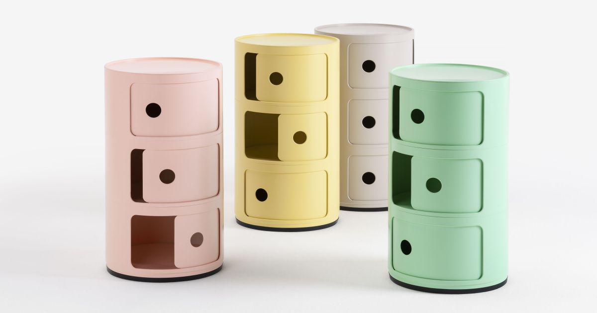 Auch andere neue Materialien kommen bei Kartell zum Einsatz. Am diesjährigen Salone del Mobile vermeldete das Unternehmen die Zusammenarbeit mit dem im Biotechnologie-Sektor tätigen Firma Bio-on. Diese stellt Biopolymere her, die zu 100 Prozent aus erneuerbaren Rohstoffen oder landwirtschaftlichen Nebenprodukten, wie zum Beispiel Zuckerrüben, Frucht- und Kartoffelabfälle, Kohlenhydrate, oder sogar Altfrittieröl, gewonnen werden. Als erstes Möbel wurde nun der 1967 entworfene Kartell-Klassikers «Componibili» in dem umweltfreundlichen und nachhaltigen Biokunststoff in die Produktion aufgenommen. Die dreimodulige Version ist in den vier Farben Grün, Pink, Creme und Gelb erhältlich.