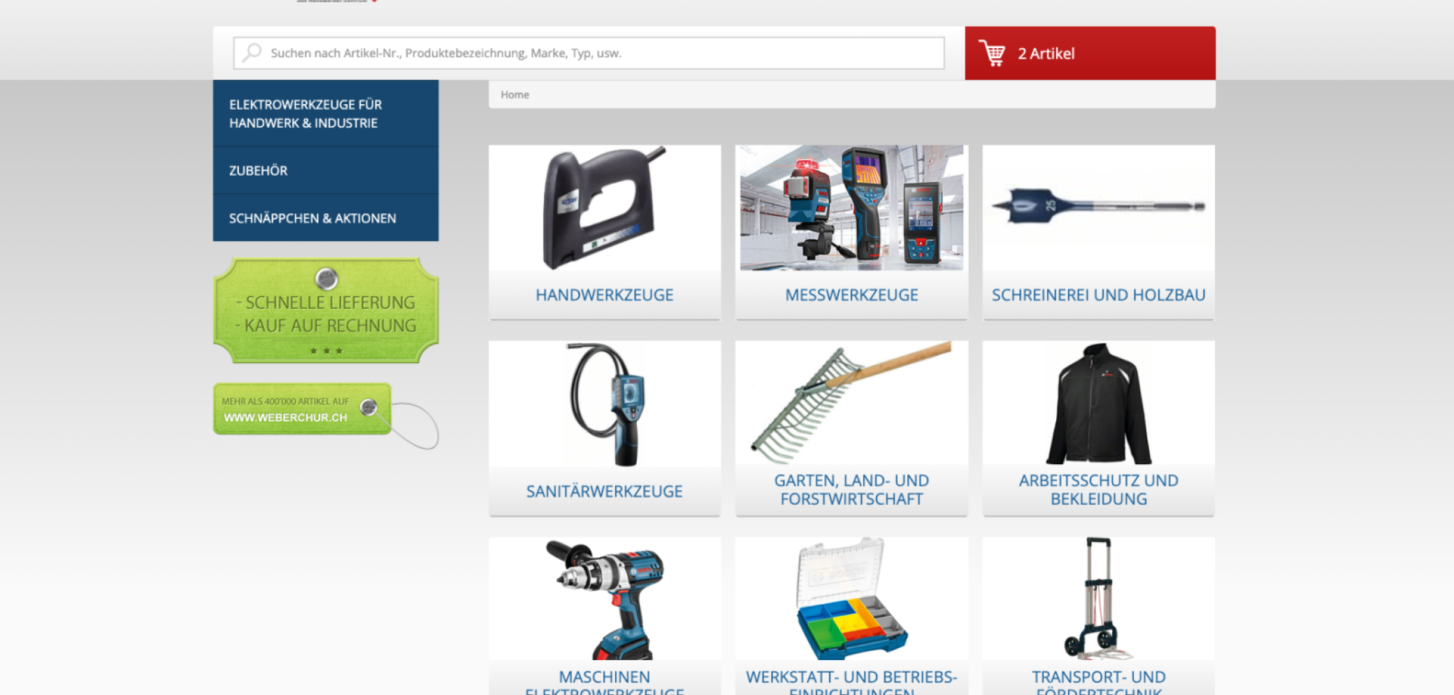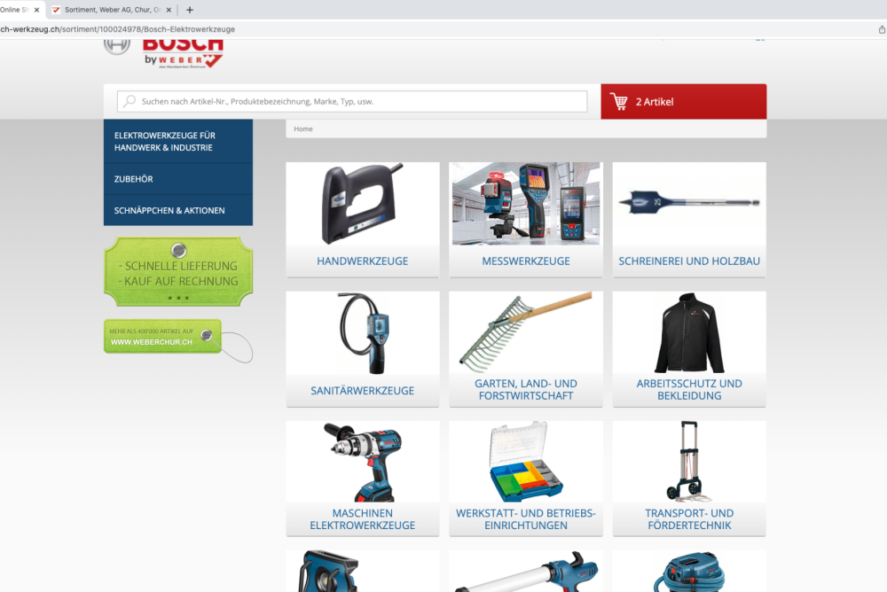 Webshop der Woche. Die blauen Maschinen und Geräte der Robert Bosch GmbH, finden sich auch in einem Schweizer Webshop. Anbieter des virtuellen Flagship-Store ist ein Churer Handwerkerzentrum.