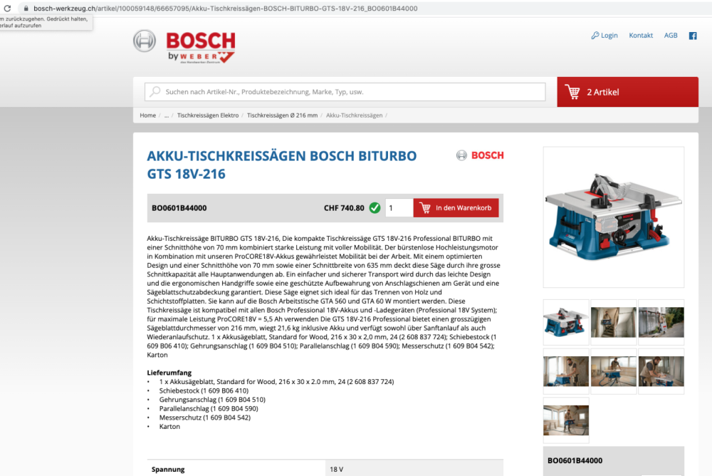 Der Webshop ist unspektakulär aber praktisch eingerichtet. Das Angebot reicht von bekannten Elektrowerkzeugen wie Bohrmaschinen, Fräsen oder Winkelschleifer bis hin zu Schutzbrillen. Schreiner und Holzbauer finden ausserdem Holzbohrer aller Art sowie Sägeblätter und Fräser. Auch Lasermessgeräte, Wärmebildkameras oder Staubsauger sind zu haben. Zum gewünschten Produkt gelangt man entweder mittels einiger Klicks durch die Artikelgruppen, was etwas Ausdauer erfordert. Oder man gibt, sofern bekannt, die Artikel-Nummer oder die genaue Produktbezeichnung in die Suchmaske ein. So geht es schneller. Farbsymbole zeigen an, ob ein Produkt aktuell verfügbar ist oder nicht. Man kann sich auch nur die verfügbaren Artikel anzeigen lassen.