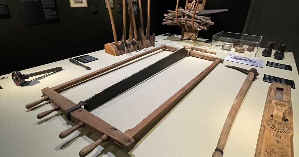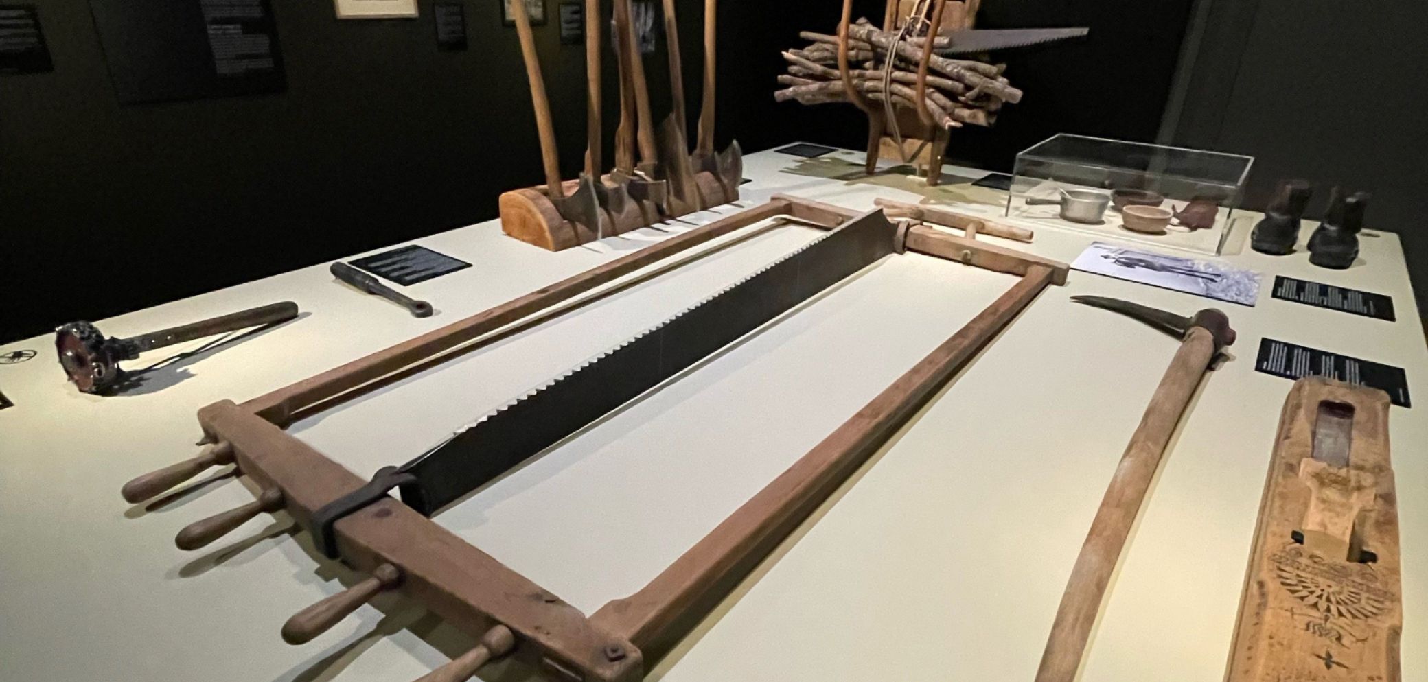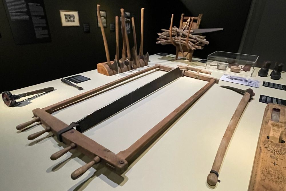 Hart und beschwerlich war im 19. Jahrhundert die Arbeit im Wald. Die Transporte waren risikoreich. Dies wird den Ausstellungsbesuchern klar beim Betrachten der Bildergalerien und Arbeitsgeräte, die zur Holzverarbeitung benötigt wurden. Auf weiten Transportwegen wurde das Holz gerne auf dem Wasserweg «geflösst», was gefährlich und somit gut bezahlte Arbeit war. Bis weit ins 19. Jahrhundert hinein prägte der Werkstoff Holz das Leben der Menschen. Zuerst als Brennstoff, später als Werk- und Baustoff. Alltägliche Gebrauchsgegenstände, wie auch Werkzeuge wurden aus Holz gefertigt.