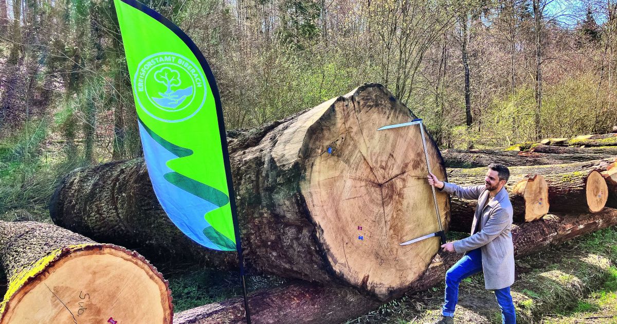 Neben dem Stamm wirkt Forstingenieur Timo Ewald trotz seiner 1,85 m Körpergrösse eher klein. Bild: Landratsamt Biberach
