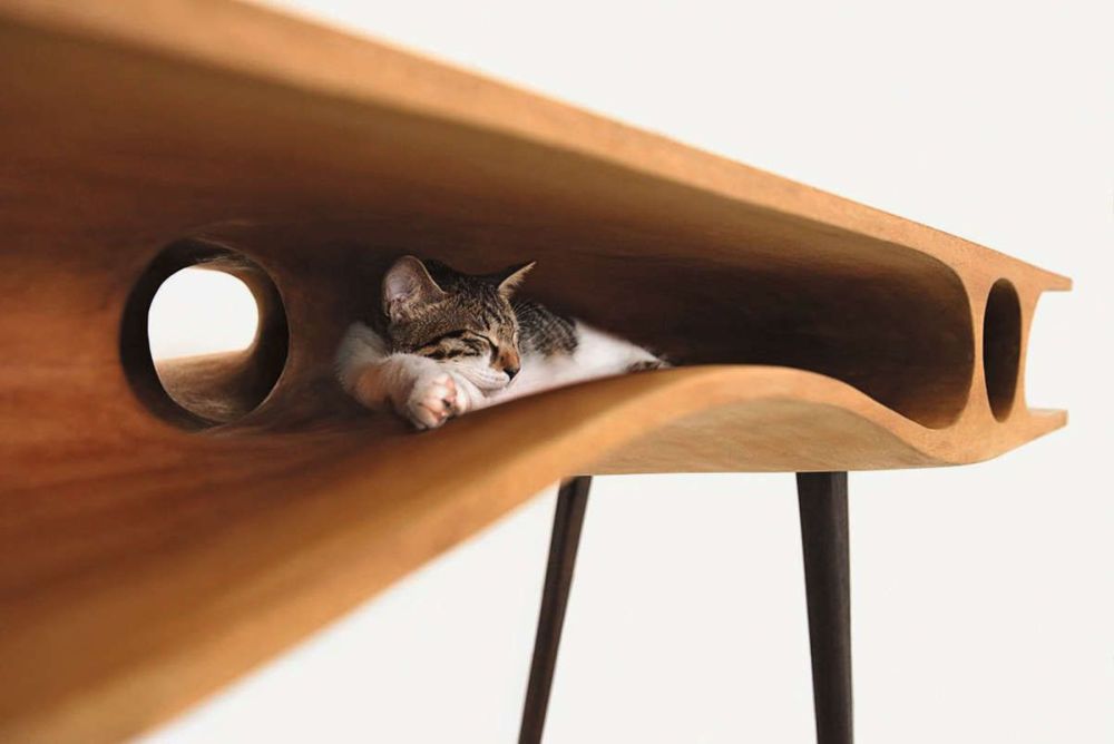 Lo studio LYCS Architecture ha progettato un tavolo, dall’esplicativo nome di CATable, che è, allo stesso tempo, un appoggio o una postazione di lavoro per le persone e un «parco giochi» per il gatto di casa. Realizzato a mano e completamente in legno, il tavolo è caratterizzato da una serie di aperture e tunnel in cui può intrufolarsi, studiati apposta per solleticare la sua curiosità, distraendolo da quello che fa il padrone che può così condividere «pacificamente» lo stesso spazio. Al modello 1.0 è stato recentemente affiancato CATable 2.0, non propriamente un tavolo ma un sistema modulare composto da quattro elementi cubici della stessa dimensione. Ognuno di essi è studiato per ospitare sia le scorribande feline sia per essere usato dai loro padroni nella parte rimanente. I moduli possono fungere da sgabelli, da tavolini da caffè, da piccola panca o da libreria se combinati insieme.