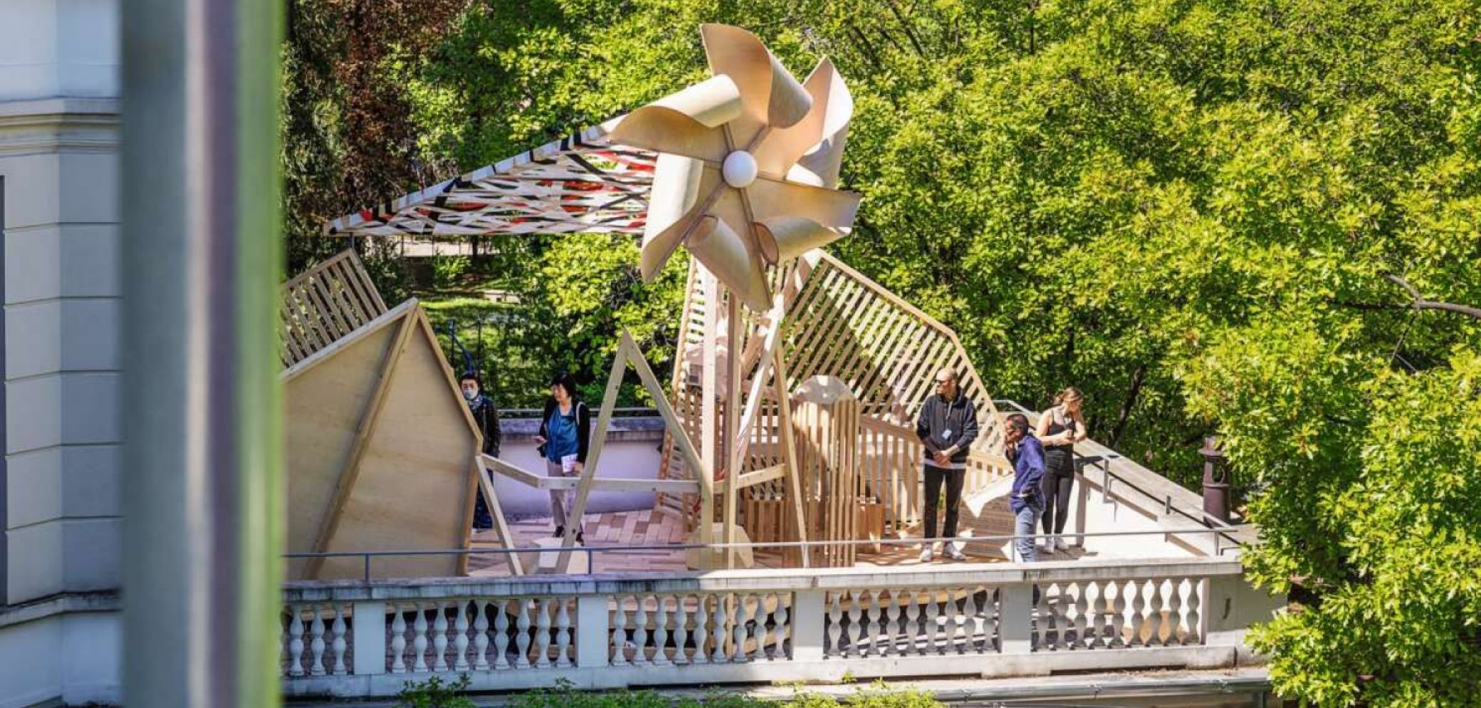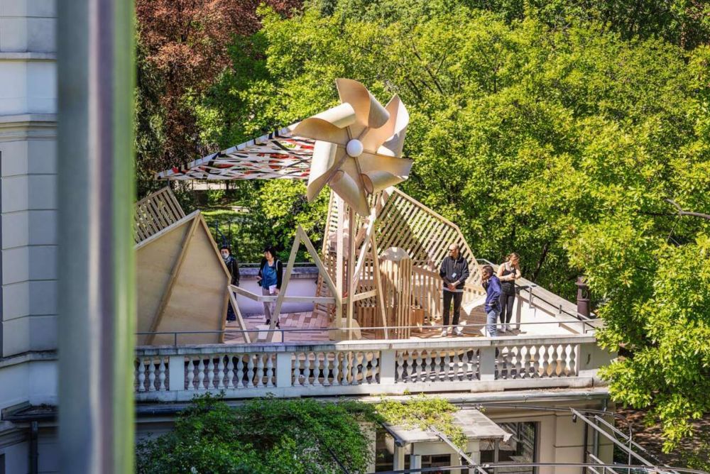 Die Holzelemente sollen im städtischen Raum für Schatten und das Windrad für eine sanfte Brise sorgen – das die Idee hinter der HFTG-«Klimaanlage», hier auf der Terrasse des «House of Switzerland» in Mailand. Bild: Sébastien Crettaz (House of Switzerland, Mailand)
