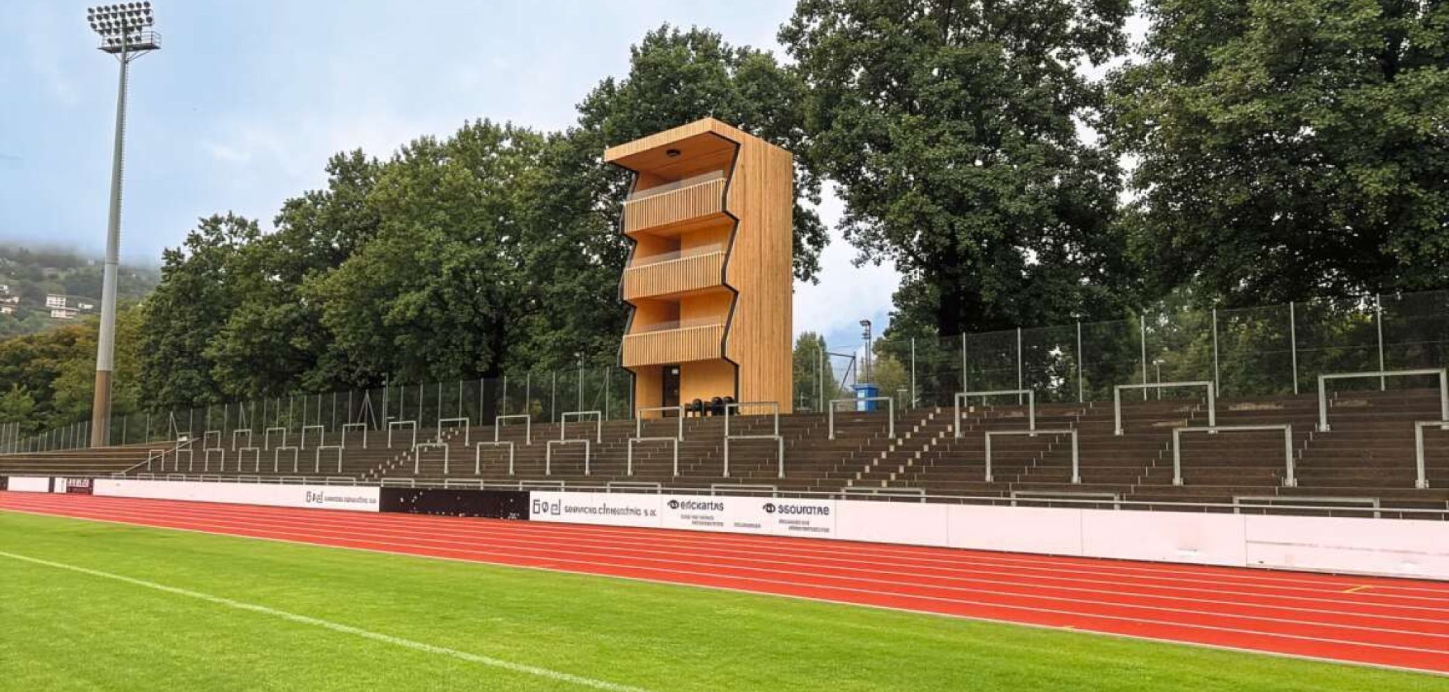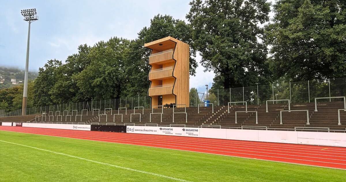 La torre per le riprese televisive allo stadio comunale di Bellinzona è un esempio concretodi economia circolare che diventa anche memoria condivisa. Immagine: Henrik Bang