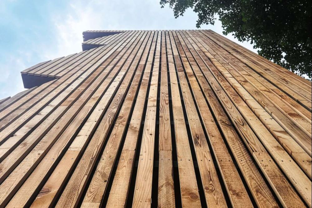 La nuova torretta stampa dello stadio comunale di Bellinzona è sicuramente un esempio interessante in quanto i correntini del tetto delle Scuole Nord, rimossi dal progetto di ristrutturazione, non sono finiti in discarica, bensì sono stati trasformati in legname di copertura, come spiega con orgoglio Henrik Bang, direttore di federlegno.ch e municipale di Bellinzona, all’origine del processo di recupero. «La storia della città si intreccia con i materiali che l’hanno costruita. Negli stessi anni in cui nasceva l’Associazione calcio Bellinzona (1904), l’ossatura del tetto delle Scuole Nord (costruzione 1906–1907) veniva costruita con legno di abete tagliato presumibilmente all’inizio del ’900. Dopo oltre un secolo, il legno torna a nuova vita per rivestire con eleganza la torretta nel cuore del campo di calcio, a pochi metri dalle scuole comunali».