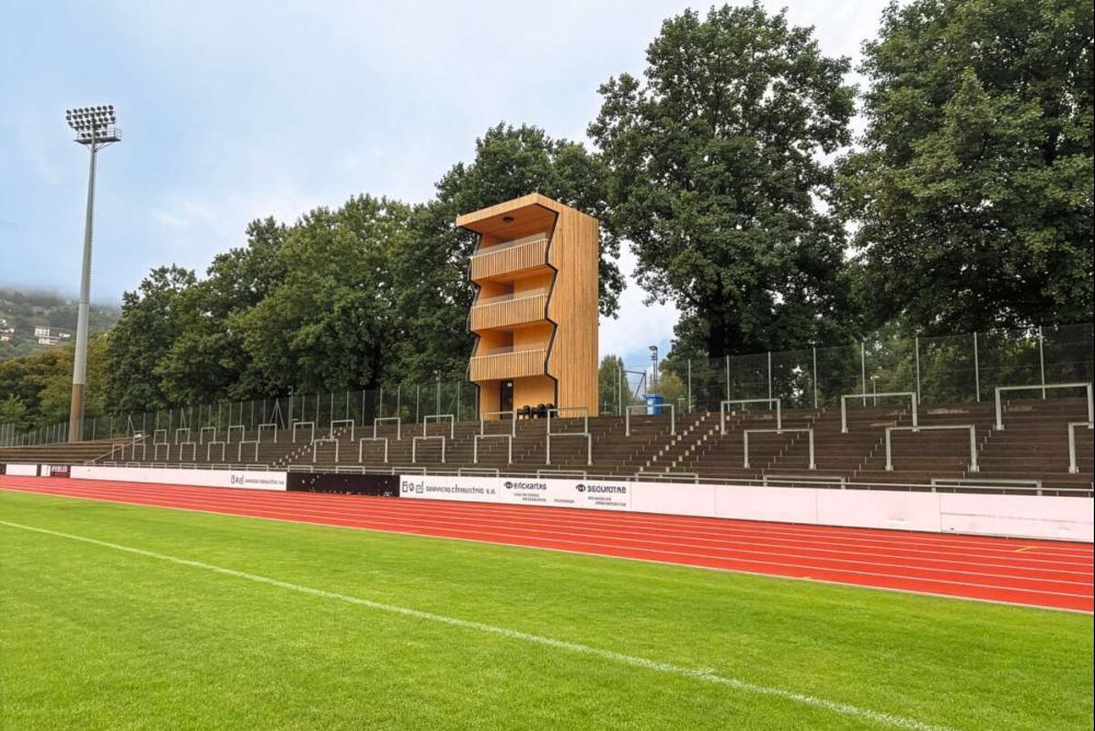 La torre è interamente in legno ed è stata realizzata dall’azienda Laube di Biasca con processi costruttivi a secco che riducono significativamente le emissioni di CO2, una scelta anch’essa orientata a un approccio innovativo e rispettoso dell’ambiente. Henrik Bang: «Ogni elemento della struttura è stato progettato per essere riutilizzabile e, a fine vita, completamente riciclabile, compresa la struttura di ancoraggio in acciaio. La struttura può infatti essere smontata e rimontata per permettere l’eventuale realizzazione di una nuova tribuna. Sin dalle prime fasi progettuali era chiaro che questa torre dovesse incarnare un’idea di modernità e sostenibilità. Ci si è ispirati a tutti i principali fattori che definiscono un edificio davvero sostenibile: non solo l’aspetto ambientale – troppo spesso evocato come slogan – ma anche la sostenibilità economica, sociale, tecnica e culturale. Possiamo quindi affermare con convinzione che questo manufatto rappresenti un esempio concreto di sostenibilità a 360 gradi».