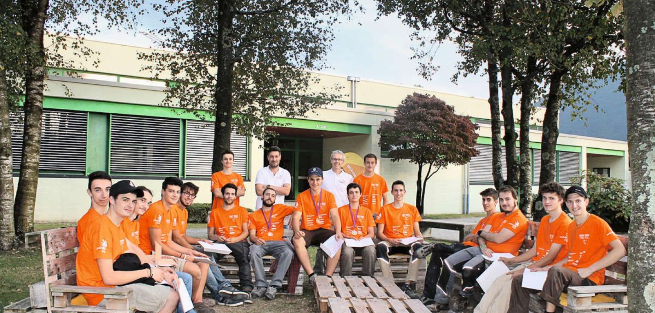 Ticino Skills ha premiato Francesco De Filippo nella foto (al centro tra Aldo Bugada, a destra, e Stefano Pellegrini) attorniato dagli apprendisti. Immagine: Vania Castelli